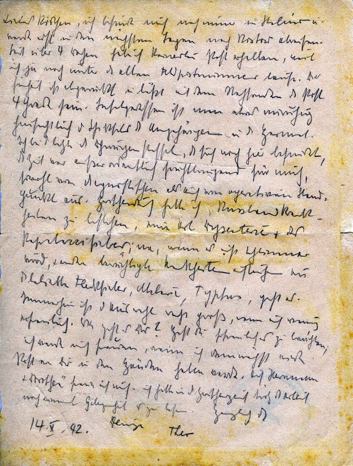 ich befinde mich noch immer in Stalino und werde erst in den nächsten Tagen nach Rostow abreisen. Sei über 4 Wochen habe ich keinerlei Post erhalten, weil ich ja noch unter der alten Feldpostnummer laufe. Die Einheit ist abgerückt und lässt mit dem Nachsenden der Post vier gerade sein. Infolgedessen ist man etwas unruhig hinsichtlich des Schicksals der Angehörigen in der Heimat. Ich bin der letzte der Chirurgenstaffel, der sich noch hier befindet, die Zeit war außerordentlich fruchtbringend für mich, sowohl vom diagnostischen als auch vom operativen Standpunkt aus. Zwischendurch habe ich Russlandkrankheiten zu bestehen, eine Art Dysenterie1 und Pappataci-Fieber. Na, wenn es nicht schlimmer wird und andere [...] Krankheiten ausbrechen wie das beliebte Fleckfieber, Malaria, Typhus, geht es. Immerhin ist die Auswahl recht groß, wenn auch wenig erfreulich.