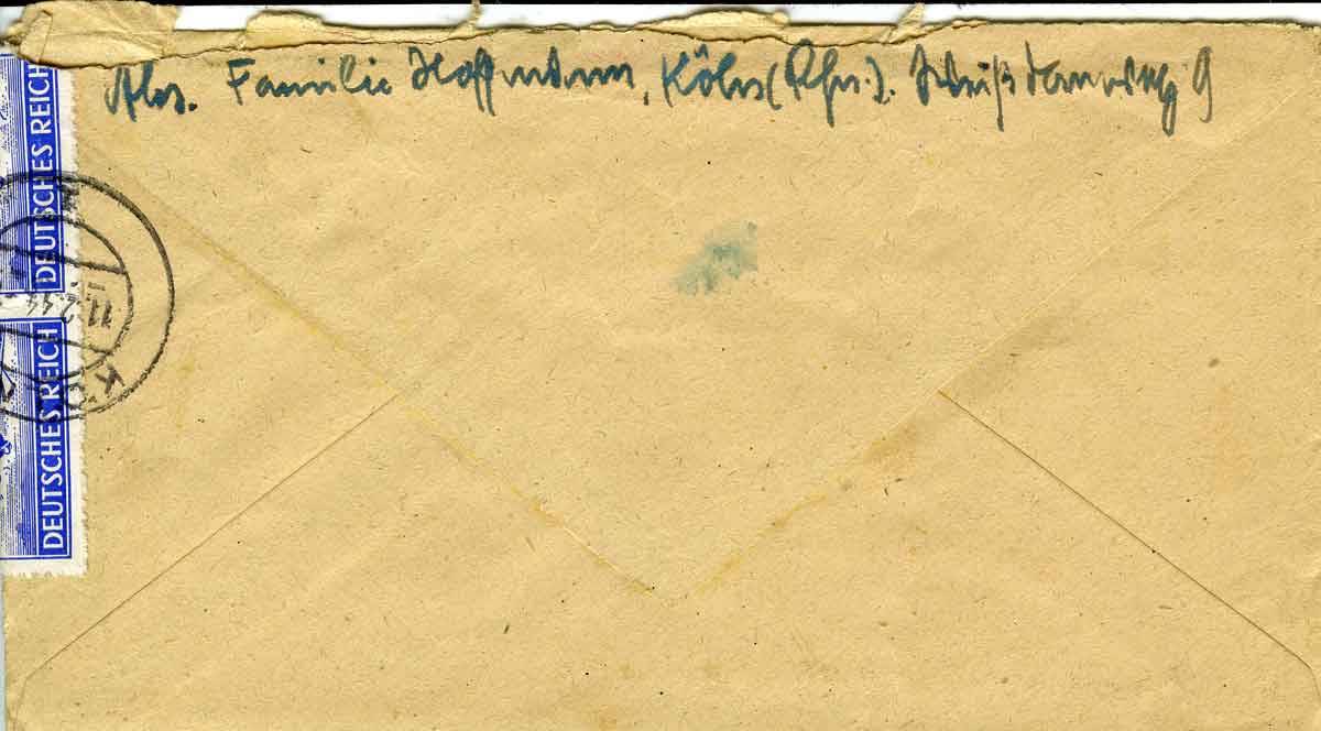 Hier in Köln hat es, trotz aller Heeresberichte über Angriffe in Westdeutschland, bisher noch gutgegangen. Köln hat in letzter Zeit noch nicht oft Fliegeralarm gehabt, tagsüber u. des nachts, aber noch kaum Angriffe. Mögen sie uns weiter verschonen u. der liebe Gott u. unsere Schutzengel uns weiter beschützen. Deine Päckchen gehen, seit dem ich auf der Post reklamiert habe bedeutend regelmäßiger ein. Abgesehen von denen, die wohl längst ihren Herr oder besser Dieb gefunden haben, sind in letzter Zeit die Päckchen alle angekommen u. sogar vielfach der Nummer nach. Die letzten Eingänge werde ich am Schluss anführen, ich habe gerade mein Verzeichnis nicht zur Hand. Diese eisernen Rationen werden eisern behütet und nur wenn nichts anderes zur Stelle ist, wird irgend eine Kleinigkeit aufgemacht. Natürlich dürfen Oma, Deine Mutter u. auch Josefa keine Not leiden. Dafür sorge ich auch schon durch meine Fahrten sowohl in die Nähe als auch in die Heimat, so dass uns bisher noch kaum etwas gefehlt hat. Dazu grase ich die ganzen Apotheken ab, um Arzneimittel, die anfangen rar zu werden, für Deine Mutter u. Oma aufzutreiben. Leider muss man für jede Kleinigkeit ein Rezept u. sogar ein neues Rezept haben. Die Aluminiumflaschen wollte ich Dir schon längst geschickt haben, aber Mutter hält mich immer davon ab, Du hättest jetzt ja doch wohl kaum noch was zum Schicken. Wie soll ich’s nur machen? Dir schicken oder nicht? Für Ölsendungen sind sie ja geradezu ideal. Auch die Erbsen und Bohnen sind großartig, da ich auch welche in Buschdorf und Umgegend aufkaufen konnte, sind wir z.Zt. so ziemlich damit versorgt u. vielleicht kannst du, wenn die Beschaffung und Verpackung zuviel Mühe macht, diese Sachen etwas stoppen. All das, was du geschickt hast, ist so herrlich und immer wieder mache ich Inventur u. besonders das Öl hat uns schon etliche Male zu wundervollen Reibekuchen verholfen von den anderen herrlichen Sachen gar nicht zu reden. Und immer,