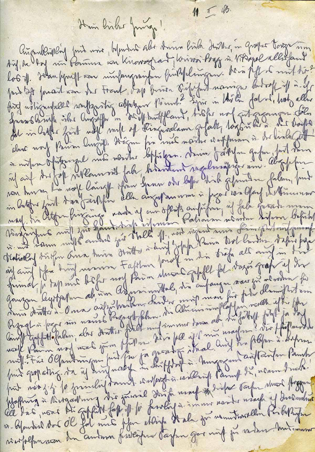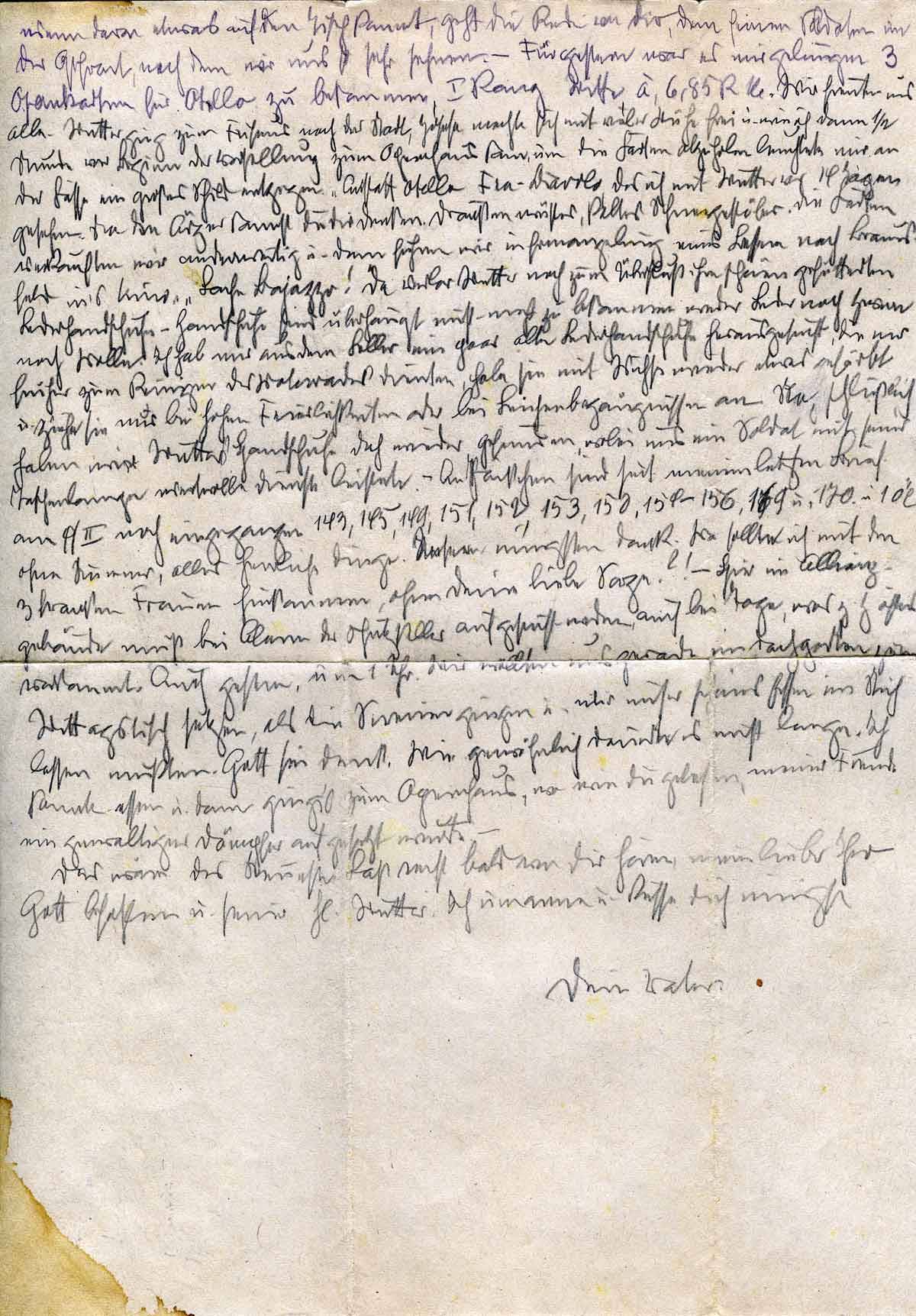 Augenblicklich sind wir, besonders aber deine liebe Mutter, in großer Sorge um Dich, da doch im Raume von Kirowograd, Kriwoi -Rogg und Nikopol allerhand los ist. Man spricht von umfangreichen Einkesselungen. Wie geht es mit Dir? Seid Ihr soweit von der Front, dass Eure Sicherheit weniger bedroht ist und Ihr euch nötigenfalls rechtzeitig absetzen könnt?