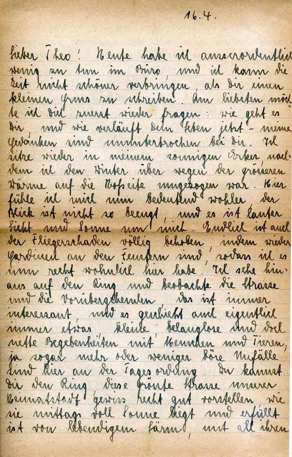 Heute habe ich außerordentlich wenig zu tun im Büro, und ich kann die Zeit nicht schöner verbringen als Dir einen kleinen Gruß zu schreiben. - Am liebsten möchte ich Dich zuerst wieder fragen: wie geht es Dir , und wie verläuft Dein Leben jetzt, meine Gedanken sind ununterbrochen bei Dir. Ich sitze wieder in meinem sonnigen Erker, nachdem ich den Winter über wegen der größeren Wärme auf die Hofseite umgezogen war. Hier fühle ich mich bedeutend wohler, der Blick ist nicht so beengt, und es ist lauter Licht und Sonne um mich. Endlich ist auch der Fliegerschaden völlig behoben, indem wieder Gardinen an den Fenstern sind, sodass ich es nun recht wohnlich hier habe. Ich sehe hinaus auf den Ring und beobachte die Strasse und die Vorübergehenden, das ist immer interessant, und es geschieht auch eigentlich immer etwas, kleine, belanglose und doch nette Begebenheiten mit Menschen und Tieren, ja sogar mehr oder weniger böse Unfälle sind hier an der Tagesordnung. Du kannst Dir den Ring, diese größte Straße unserer Heimatstadt gewiß recht gut vorstellen, wie sie mittags voll Sonne liegt und erfüllt ist von lebendigem Lärm mit all ihren