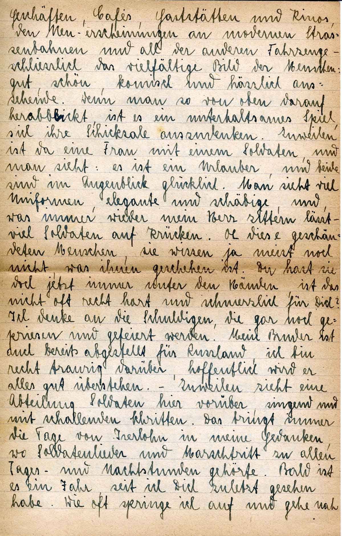 Geschäften, Cafés, Gaststätten und Kinos, den Neuerscheinungen an modernen Straßenbahnen und all der anderen Fahrzeuge - schließlich das vielfältige Bild der Menschen: gut, schön, komisch und hässlich aussehende. Wenn man so von oben darauf herabblickt, ist es ein unterhaltsames Spiel, sich ihre Schicksale auszudenken. Zuweilen ist da eine Frau mit einem Soldaten und man sieht, es ist ein Urlauber, und beide sind im Augenblick glücklich. Man sieht viel Uniformen, elegante und schäbige, und was immer wieder mein Herz zittern lässt - viele Soldaten auf Krücken. Oh diese geschändeten Menschen, sie wissen ja meist noch nicht, was ihnen geschehen ist. Du hat sie doch jetzt immer unter den Händen, ist das nicht oft recht hart und schmerzlich für Dich? Ich denke an die Schuldigen, die gar noch gepriesen und gefeiert werden. Mein Bruder ist auch bereits abgestellt für Rußland, ich bin recht traurig darüber, hoffentlich wird er alles gut überstehen. - Zuweilen zieht eine Abteilung Soldaten hier vorüber, singend und mit schallenden Schritten. Das bringt immer die Tage von Iserlohn in meine Gedanken, wo Soldatenlieder und Marschtritt zu allen Tages- und Nachtstunden gehörten. Bald ist es ein Jahr, seit ich Dich zuletzt gesehen habe. Wie oft springe ich auf und gehe nah