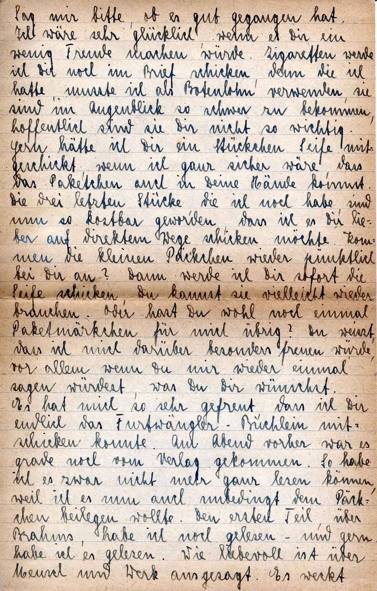 Sag mir bitte, ob es gut gegangen hat. Ich wäre sehr glücklich, wenn es Dir ein wenig Freude mache würde. Zigaretten werde ich Dir noch im Brief schicken, denn die ich hatte, musste ich als Botenlohn verwenden, sie sind im Augenblick so schwer zu bekommen, hoffentlich sind sie Dir nicht so wichtig. Gern hätte ich Dir ein Stückchen Seife mitgeschickt, wenn ich ganz sicher wäre, dass das Paketchen auch in Deine Hände kommt. Die drei letzten Stücke, die ich noch habe, sind nun so kostbar geworden, dass ich es Dir lieber auf direktem Wege schicken möchte. Kommen die kleinen Päckchen wieder pünktlich bei Dir an? Dann werde ich Dir sofort die Seife schicken, Du kannst sie vielleicht wieder brauchen. Oder hast du wohl noch einmal Paketmärkchen für mich übrig? Du weißt, dass ich mich darüber besonders freuen würde, vor allem wenn Du mir wieder einmal sagen würdest, was Du Dir wünschst. Es hat mich so sehr gefreut, das ich Dir endlich das Furtwängler-Büchlein mitschicken konnte. Am Abend vorher war es gerade noch vom Verlag gekommen. So habe ich es zwar nicht mehr ganz lesen können, weil ich es nun auch unbedingt dem Päckchen beilegen wollte. Den ersten Teil, über Brahms, habe ich noch gelesen - und gern habe ich es gelesen. Wie liebevoll ist über Mensch und Werk ausgesagt. Es weckt
