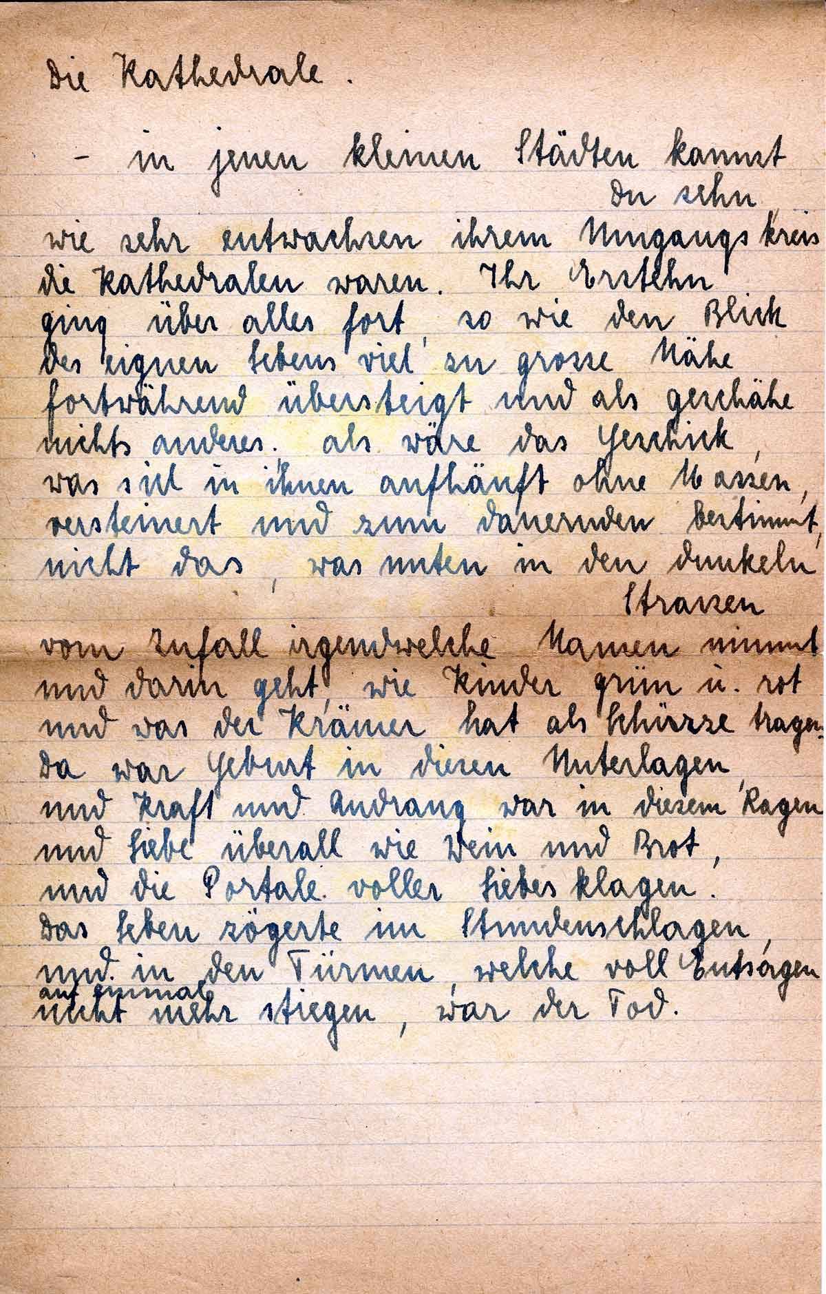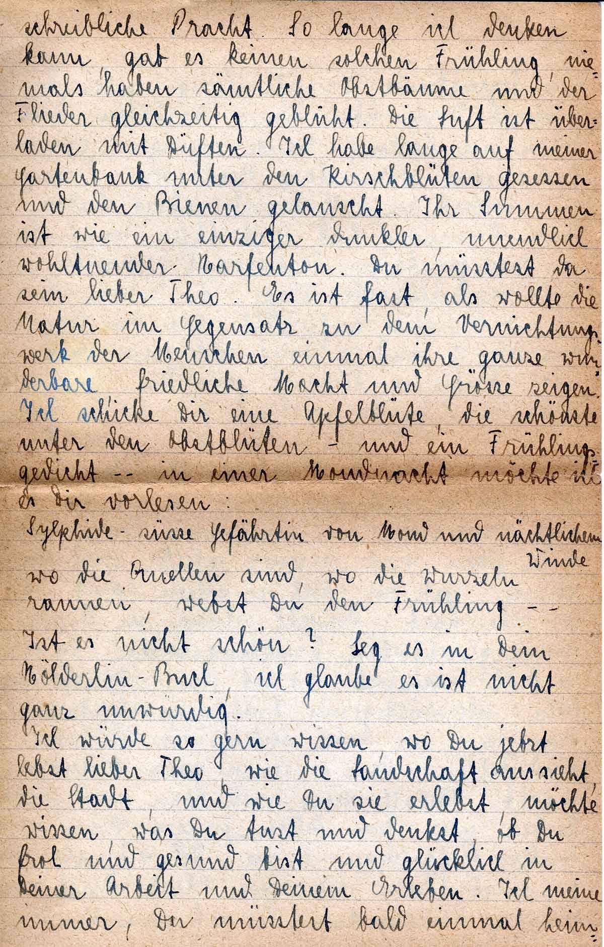 Ich würde so gern wissen, wo Du jetzt lebst lieber Theo, wie die Landschaft aussieht, die Stadt, und wie Du sie erlebst, möchte ich wissen, was Du tust und denkst, ob Du froh und gesund bist und glücklich in Deiner Arbeit und Deinem Erleben. Ich meine immer, du müsstest bald einmal heim-