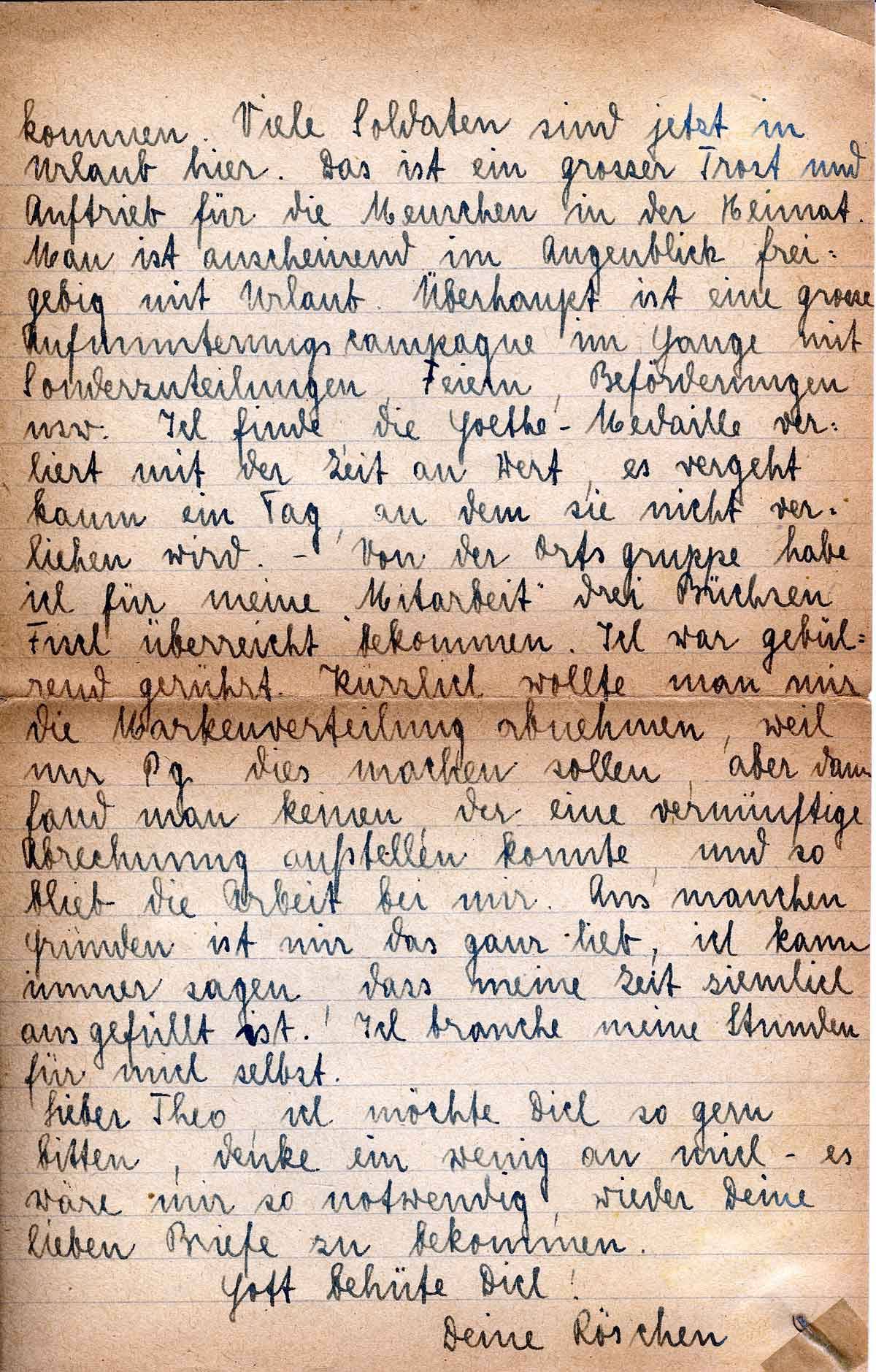 kommen. Viele Soldaten sind jetzt in Urlaub hier. Das ist ein großer Trost und Auftrieb für die Menschen in der Heimat. Man ist anscheinend im Augenblick freigebig mit Urlaub. Überhaupt ist eine grosse Aufmunterungscampagne im Gange mit Sonderzuteilungen, Feiern, Beförderungen usw: Ich finde, die Goethe-Medaille verliert mit der Zeit an Wert, es vergeht kaum ein Tag, an dem sie nicht verliehen wird. - Von der Ortsgruppe habe ich für meine Mitarbeit drei Büchsen Fisch überreicht bekommen. Ich war gebührend gerührt. Kürzlich wollte man mir die Markenverteilung abnehmen, weil nur PG dies machen sollen, aber dann fand man keinen, der eine vernünftige Abrechnung aufstellen konnte, und so blieb die Arbeit bei mir. Aus manchen Gründen ist mir das ganz lieb, ich kann immer sagen, dass meine Zeit ganz ausgefüllt ist. Ich brauche meine Stunde für mich selbst.