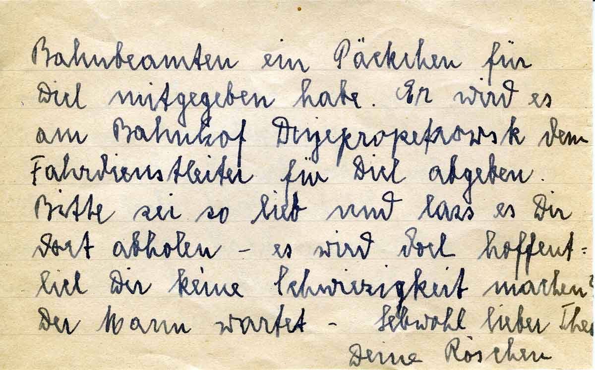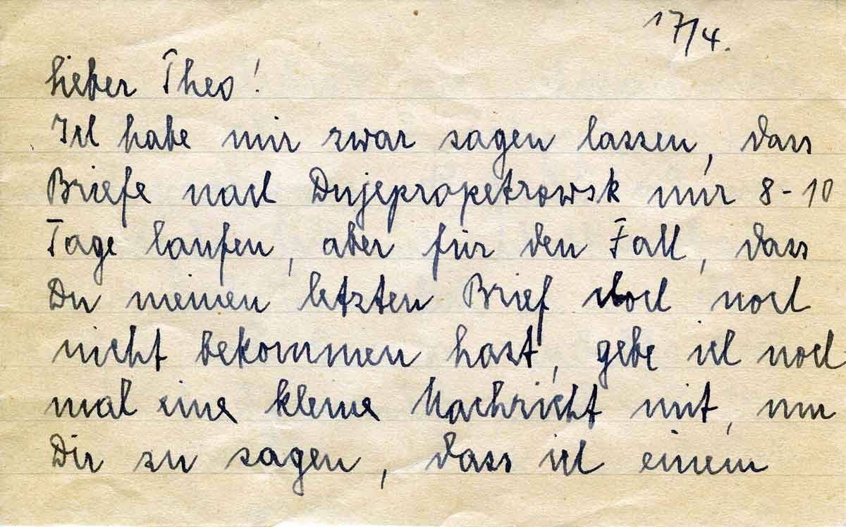 Ich habe mir zwar sagen lassen, dass Briefe nach Dnjepropetrowsk nur 8-10 Tage laufen, aber für den Fall, dass Du meinen letzten Brief doch noch nicht bekommen hast, gebe ich noch mal eine kleine Nachricht mit, um Dir zu sagen, dass ich einem