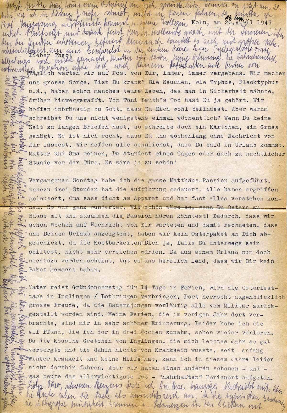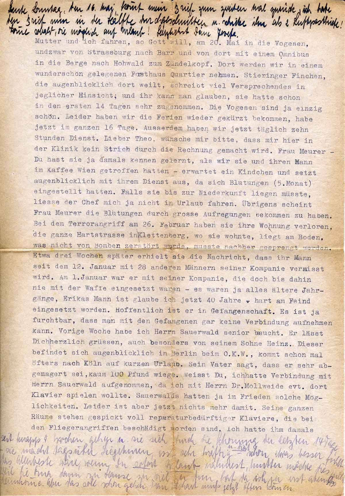 Lieber Theo, wünsche mir bitte, dass mir hier in der Klinik kein Strich durch die Rechnung gemacht wird. Frau Meurer –Du hast sie ja damals kennen gelernt, als wir sie und ihren Mann im Kaffee Wien getroffen hatten – erwartet ein Kindchen und setzt augenblicklich mit ihrem Dienst aus, da sich Blutungen (5. Monat) eingestellt hatten. Falls sie bis zur Niederkunft liegen müsste, ließe der Chef mich ja nicht in Urlaub fahren. Übrigens scheint Frau Meurer die Blutungen durch große Aufregung bekommen zu haben. Bei dem Terrorangriff am 26. Februar haben sie ihre Wohnung verloren, die ganze Hartstrasse in Klettenberg, wo sie wohnte, liegt am Boden, was nicht von Bomben zerstört wurde, musste nachher gesprengt werden. Etwa drei Wochen später erhielt sie die Nachricht, dass ihr Mann seit dem 12. Januar mit 28 anderen Männern seiner Kompanie vermisst wird. Ab 1. Januar war er mit seiner Kompanie, die doch bis dahin nie mit der Waffe eingesetzt waren - es waren ja alles ältere Jahrgänge, Erikas Mann ist, glaube ich, jetzt 40 Jahre - hart am Feind eingesetzt worden. Hoffentlich ist er in Gefangenschaft. Es ist ja furchtbar, dass man mit den Gefangenen gar keine Verbindung aufnehmen kann. Vorige Woche habe ich Herrn Sauerwald senior besucht. Er lässt Dich herzlich grüßen, auch besonders von seinem Sohn Heinz. Dieser befindet sich augenblicklich in Berlin beim O.K.W., kommt schon mal öfters nach Köln auf kurzen Urlaub. Sein Vater sagt, dass er sehr abgemagert sei, kaum 100 Pfund wiege. Weißt Du, ich hatte Verbindung mit Herrn Sauerwald aufgenommen, da ich mit Herrn Dr. Mollweide evtl. dort Klavier spielen wollte. Sauerwalds hatten ja im Frieden solche Möglichkeiten. Leider ist aber jetzt nichts mehr damit. Seine ganzen Räume stehen jetzt gespickt voll reparaturbedürftiger Klaviere, die bei den Fliegerangriffen beschädigt worden sind. Ich hatte ihm damals