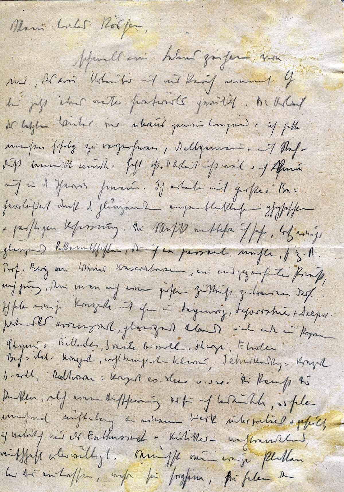 schnell ein Lebenszeichen von mir, das ein Urlauber mit ins Reich nimmt. Ich bin jetzt etwas weiter frontwärts gerückt. Der Verlauf des letzten Winters war überaus gewinnbringend und ich hatte manchen Erfolg zu verzeichnen, der allgemein und mit Nachdruck bemerkt wurde. Jetzt ist der Arbeit nicht viel und ich knie mich in die Chemie hinein. Ich arbeite mit großer Beharrlichkeit dank der glänzenden augenblicklichen physischen und geistigen Verfassung. Die Musik entbehr ich sehr, trotz einiger glänzender Bekanntschaften, die ich en passant mache. So z.B. Prof. Berg vom Wiener Konservatorium, ein ausgezeichneter Geist, noch jung , dem man noch eine größere Zukunft zutrauen darf. Ich habe einige Konzerte mit ihm in Taganrog, Sparoschje und Dnjepropetrowsk arrangiert, glänzende Abende und unter anderem im Programm: Chopin- Balladen, Sonate b-moll, Bach: italien. Konzert, wohltemperiertes Klavier, Tschaikowski : Konzert b-moll, usw. Du kannst Dir denken, welch eine Anstrengung das für mich bedeutete. Wir haben manchmal nächtelang an einem Werk interpretiert und gefeilt, ich natürlich der Enthusiast und Kritiker – nachtwandelnd, rauschhaft überwältigt. Demnächst werden einige Platten bei Dir eintreffen, wahre sie sorgsam, sie haben den