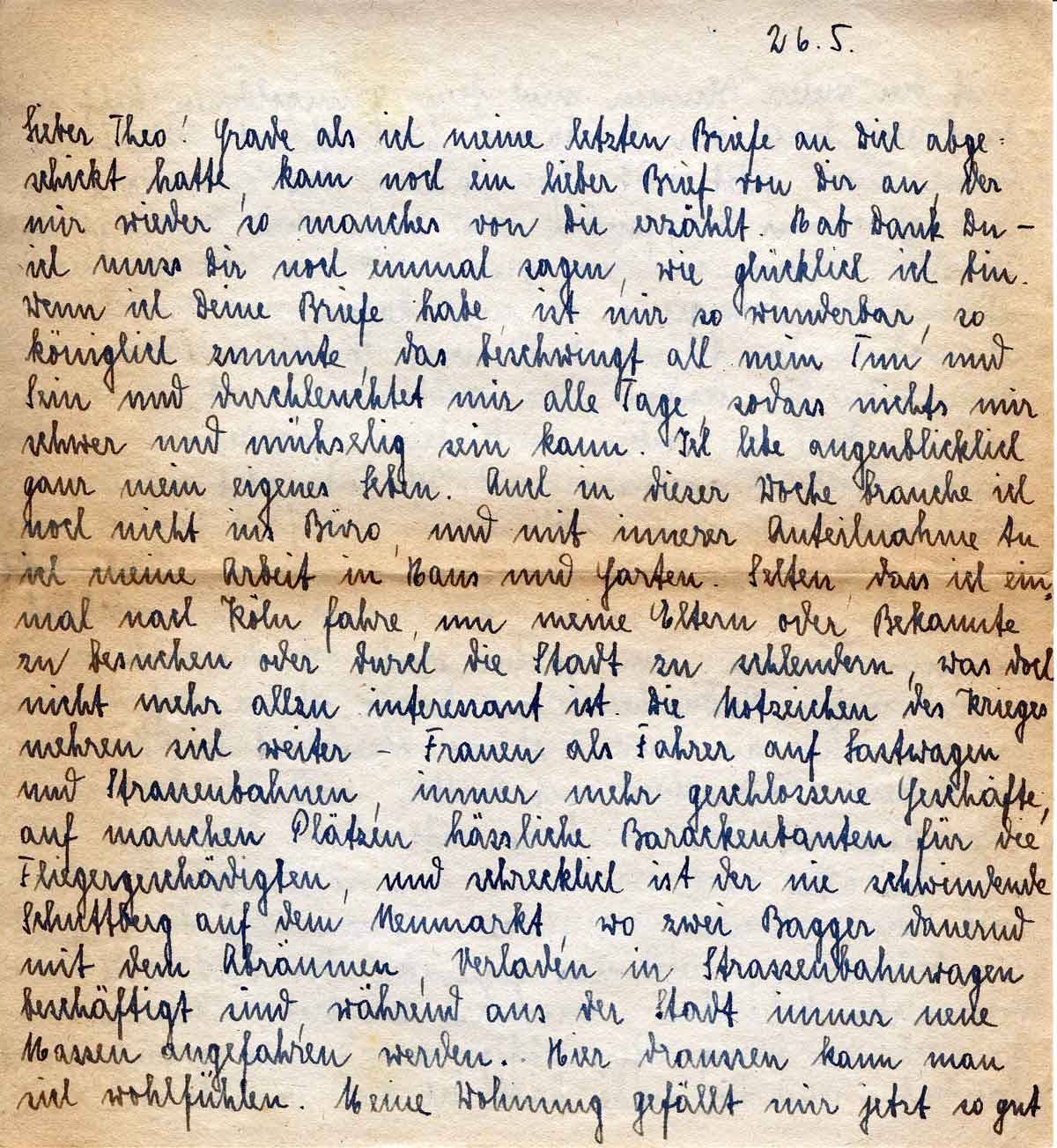 Gerade als ich meine letzten Briefe an Dich abgeschickt hatte, kam noch ein lieber Brief von Dir an, der mir wieder so manches von Dir erzählt. Hab Dank Du - ich muss dir noch einmal sagen, wie glücklich ich bin. Wenn ich Deine Briefe habe, ist mir so wunderbar, so königlich zumute, das beschwingt all mein Tun und Sein und durchleuchtet mir alle Tage, sodass nichts mir schwer und mühselig sein kann. Ich lebe augenblicklich nur mein eigenes Leben. Auch in dieser Woche brauche ich noch nicht ins Büro, und mit innerer Anteilnahme tue ich meine Arbeit in Haus und Garten.Selten, dass ich einmal nach Köln fahre, um meine Eltern oder Bekannte zu besuchen oder durch die Stadt zu schlendern, was nicht mehr allzu interessant ist. Die Notzeiten des Krieges mehren sich weiter- Frauen als Fahrer auf Lastwagen und Straßenbahnen, immer mehr geschlossenen Geschäfte, auf manchen Plätzen hässliche Barackenbauten für die Fliegergeschädigten, und schrecklich ist der nie schwindende Schuttberg auf dem Neumarkt, wo zwei Bagger dauernd mit dem Abräumen, Verladen in Straßenbahnwagen beschäftigt sind, während aus der Stadt immer neue Massen angefahren werden - Hier draußen kann man sich wohlfühlen. Meine Wohnung gefällt mir jetzt so gut