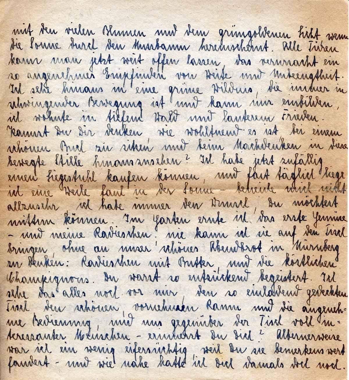 mit den vielen Blumen und dem grüngoldenen Licht, wenn die Sonne durch den Nussbaum hereinscheint. Alle Türen kann man jetzt weit offen lassen, das verursacht ein so angenehmes Empfinden von Weite und Unbeengtheit. Ich sehe hinaus in eine grüne Wildnis, die immer in schwingender Bewegung ist und kann mir einbilden, ich wohnte im tiefen Wald und lauterem Frieden. Kannst Du Dir denken, wie wohltuend es ist, bei einem schönen Buch zu sitzen und beim Nachdenken in diese bewegte Stille hinaus zusehen? Ich habe jetzt zufällig einen Liegestuhl kaufen können, und fast täglich liege ich eine Weile faul in der Sonne- beneide mich nicht allzu sehr, ich habe immer den Wunsch, Du möchtest mittun können . Im Garten ernte ich das erste Gemüse – und meine Radieschen; nie kann ich sie auf den Tisch bringen, ohne an unser schönes Abendbrot in Nürnberg zu denken: Radieschen mit Butter, und die köstlichen Champignons. Du warst so entzückend begeistert.Ich sehe das alles noch vor mir, den so einladend gedeckten Tisch, den schönen, vornehmen Raum und die angenehme Bedienung, und uns gegenüber der Tisch voller interessanter Menschen - erinnerst Du Dich? Albernerweise war ich ein wenig eifersüchtig, weil Du sie bemerkenswert fandest - und wie nahe hatte ich Dich damals doch noch.