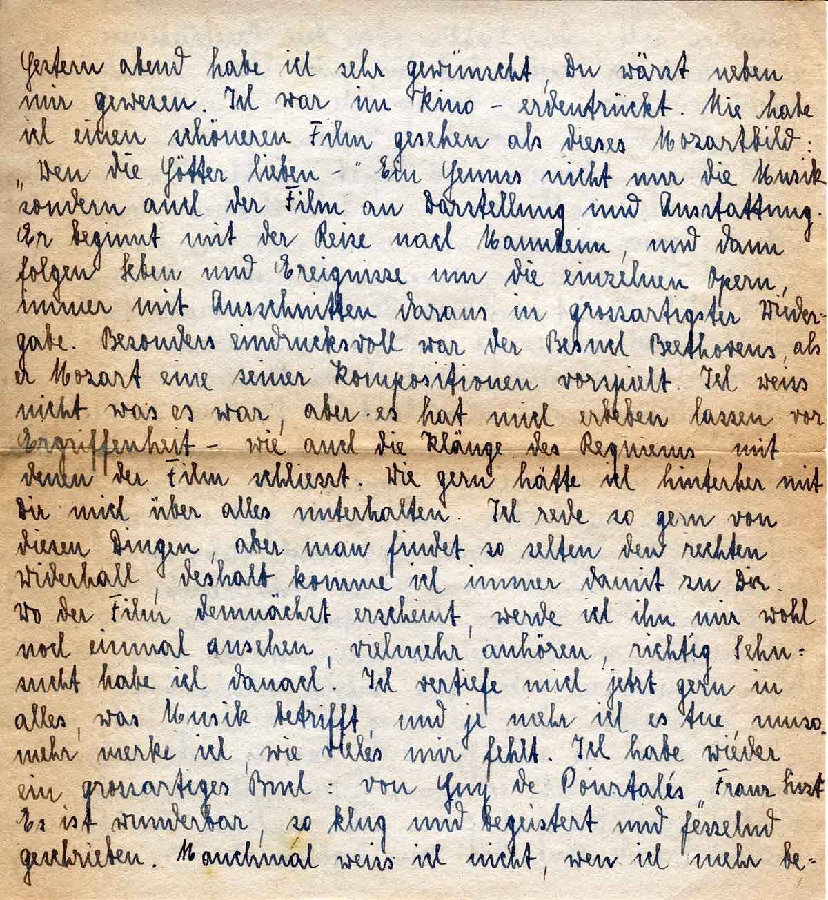 Gestern Abend habe ich sehr gewünscht, Du wärst neben mir gewesen. Ich war im Kino - erdentrückt. Nie habe ich einen schöneren Film gesehen als dieses Mozartbild: ’Wen die Götter lieben’ - Ein Genuss nicht nur die Musik, sondern auch der Film an Darstellung und Ausstattung. Er beginnt mit der Reise nach Mannheim, und dann folgen Leben und Ereignisse um die einzelnen Opern, immer mit Ausschnitten daraus in großartiger Wiedergabe. Besonders eindrucksvoll war der Besuch Beethovens, als er Mozart eine seiner Kompositionen vorspielt. Ich weiß nicht, was es war, aber es hat mich erbeben lassen vor Ergriffenheit - wie auch die Klänge des Requiems, mit denen der Film schließt. Wie gerne hätte ich hinterher mit Dir mich über alles unterhalten. Ich rede so gern von diesen Dingen ,aber man findet so selten den rechten Widerhall, deshalb komme ich immer damit zu Dir. Wo der Film demnächst erscheint, werde ich ihn mir wohl noch einmal ansehen, vielmehr anhören, richtig Sehnsucht habe ich danach. Ich vertiefe mich jetzt gern in alles ,was Musik betrifft, und je mehr ich es tue, umso mehr merke ich, wie vieles mir fehlt. Ich habe wieder eingroßartiges Buch: von Guy de Pourtalés „Franz Liszt“. Es ist wunderbar, so klug und begeistert und fesselnd geschrieben. Manchmal weiß ich nicht, wen ich mehr be-