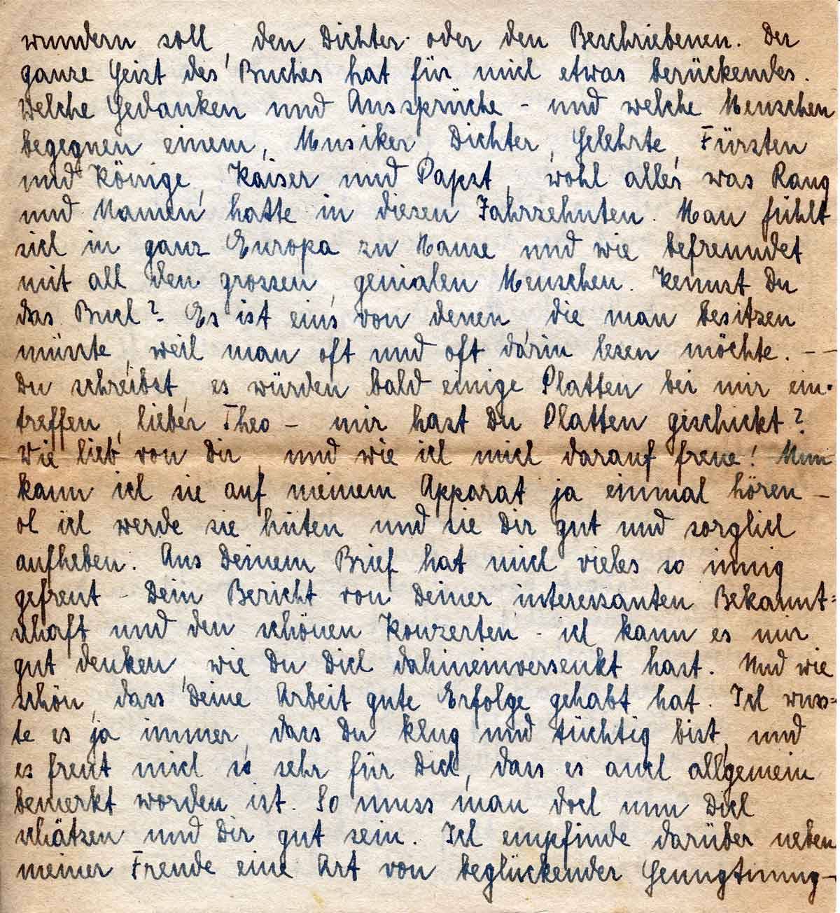 wundern soll, den Dichter oder den Beschriebenen. Der ganze Geist des Buches hat für mich etwas berückendes. Welche Gedanken und Aussprüche – und welche Menschen begegnen einem ,Musiker Dichter, Gelehrte, Fürsten und Könige, Kaiser und Papst, wohl alles was Rang und Namen hatte in diesen Jahrzehnten. Man fühlt sich in ganz Europa zu Hause und wie befreundet mit all den großen, genialen Menschen. Kennst Du das Buch? Es ist eins von denen, die man besitzen müsste, weil man oft und oft darin lesen möchte. - -Du schreibst, es würden bald einige Platten bei mir eintreffen, lieber Theo – mir hast Du Platten geschickt? Wie lieb von Dir , und wie ich mich darauf freue! Nun kann ich sie auf meinem Apparat ja einmal hören – oh ich werde sie hüten und sie Dir zu und sorglich aufheben. Aus Deinem Brief hat mich vieles so innig gefreut – Dein Bericht von Deiner interessanten Bekanntschaft und den schönen Konzerten – ich kann es mir gut denken, wie Du Dich dahineinversenkt hast. Und wie schön, dass Deine Arbeit gute Erfolge gehabt hat. Ich wusste es ja immer, dass Du klug und tüchtig bist, und es freut mich so sehr für Dich, dass es auch allgemein bemerkt worden ist. So muss man doch nun Dich schätzen und Dir gut sein. Ich empfinde darüber neben meiner Freude eine Art von beglückender Genugtuung –