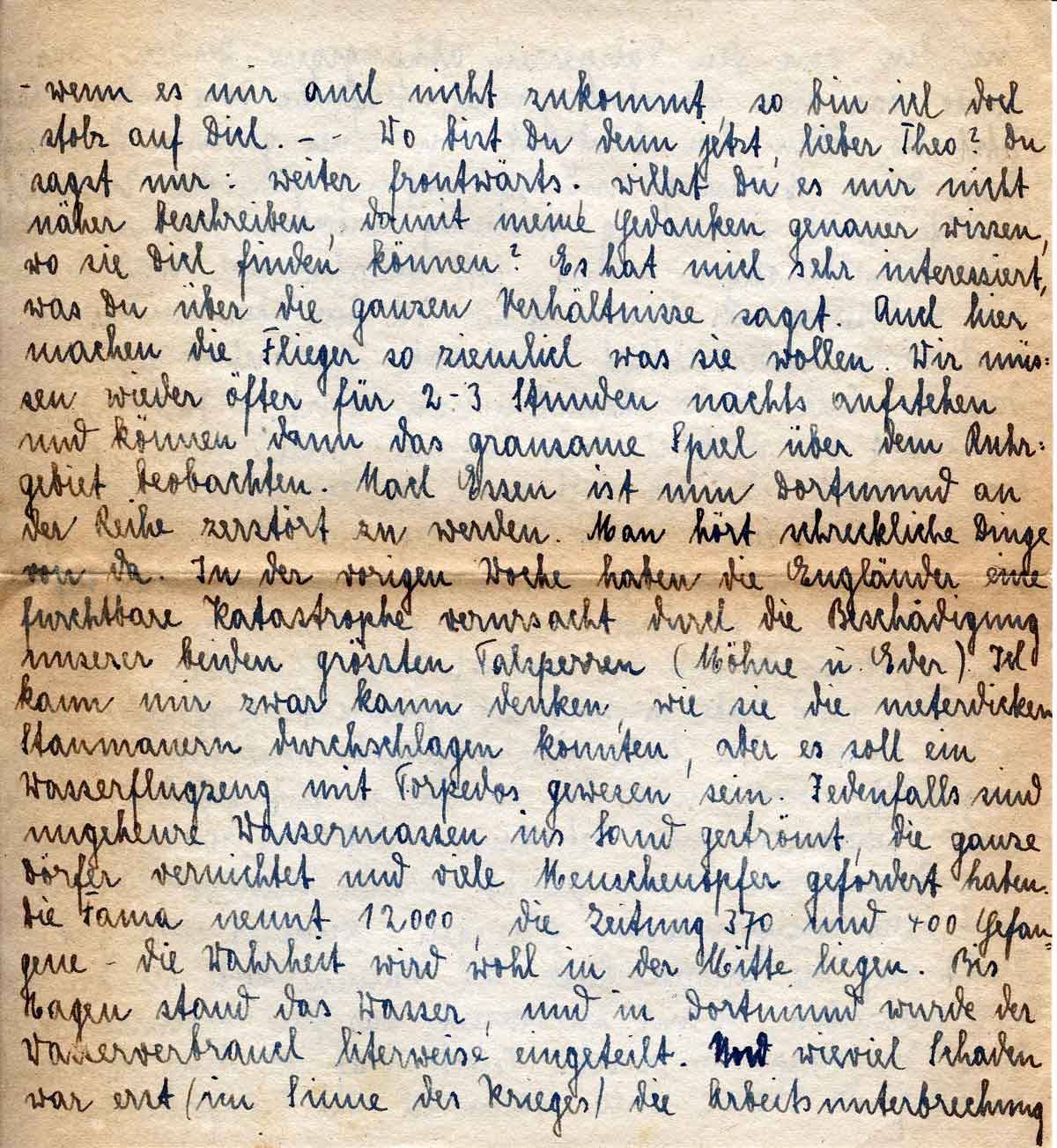 Wo bist Du denn jetzt, lieber Theo? Du sagst nur: weiter frontwärts. Willst Du es mir nicht näher beschreiben, damit meine Gedanken genauer wissen, wo sie Dich finden können? Es hat mich sehr interessiert, was Du über die ganzen Verhältnisse sagst. Auch hier machen die Flieger so ziemlich was sie wollen. Wir müssen wieder öfter für 2-3 Stunden nachts aufstehen und können dann das grausame Spiel über dem Ruhrgebiet beobachten. Nach Essen ist nun Dortmund an der Reihe zerstört zu werden. Man hört schreckliche Dinge von da. In der vorigen Woche haben die Engländer eine furchtbare Katastrophe verursacht durch die Beschädigung unserer beiden größten Talsperren (Möhne und Eder). Ich kann mir zwar kaum denken, wie sie die meterdicken Staumauern durchschlagen konnten, aber es soll ein Wasserflugzeug mit Torpedos gewesen sein. Jedenfalls sind ungeheure Wassermassen ins Land geströmt, die ganze Dörfer vernichtet und viele Menschenopfer gefordert haben. Die Fama nennt