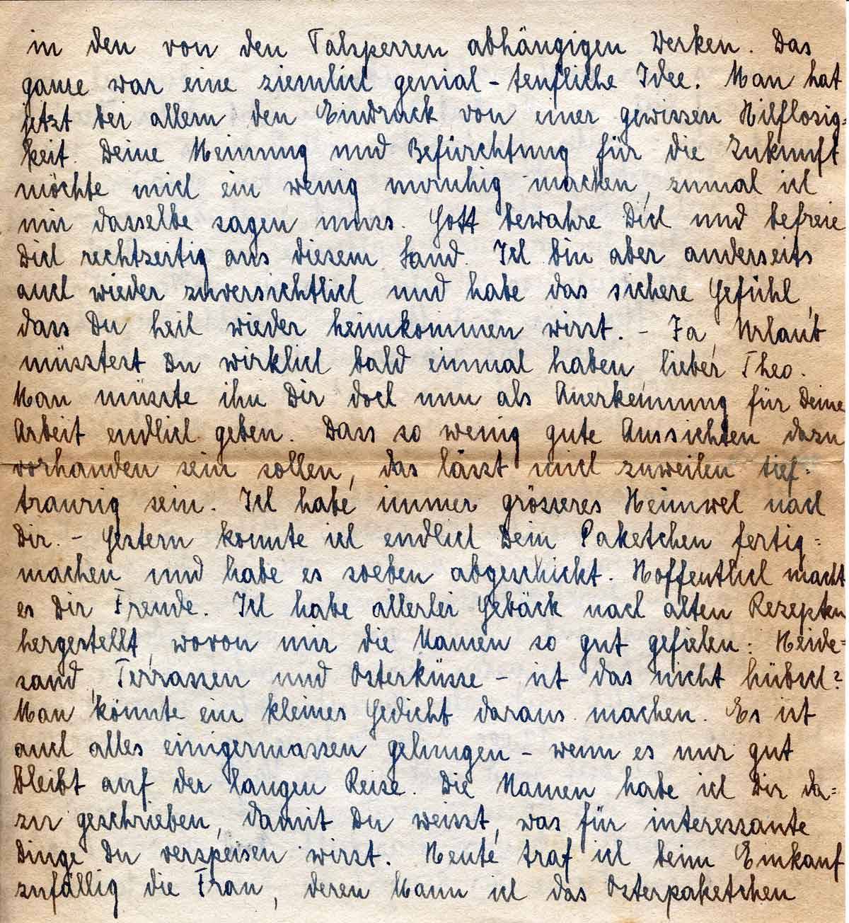 in den von den Talsperren abhängigen Werken. Das ganze war eine ziemlich genial-teuflische Idee. Man hat jetzt bei allem den Eindruck von einer gewissen Hilflosigkeit. Deine Meinung und Befürchtung für die Zukunft möchte mich ein wenig unruhig machen, zumal ich mir dasselbe sagen muss. Gott bewahre Dich und befreie Dich rechtzeitig aus diesem Land. Ich bin aber andererseits auch wieder zuversichtlich und habe das sichere Gefühl, dass Du heil heimkommen wirst. – Ja, Urlaub müsstest Du wirklich bald einmal haben, lieber Theo. Man müsste ihn Dir doch nun als Anerkennung für Deine Arbeit endlich geben. Dass so wenig gute Aussichten dafür vorhanden sein sollen, das lässt mich zuweilen tief traurig sein. Ich habe immer größeres Heimweh nach Dir.-Gestern konnte ich endlich Dein Paketchen fertig machen und habe es soeben abgeschickt. Hoffentlich macht es Dir Freude. Ich habe allerlei Gebäck nach alten Rezepten hergestellt, wovon mir die Namen so gut gefielen: Heidesand, , Terrassen und Osterküsse – ist das nicht hübsch? Man könnte ein kleines Gedicht daraus machen. Es ist auch alles einigermaßen gelungen – wenn es nur gut bleibt auf der langen Reise. Die Namen habe ich Dir dazu geschrieben, damit Du weißt, was für interessante Dinge Du verspeisen wirst. Heute traf ich beim Einkauf zufällig die Frau, deren Mann ich das Osterpaketchen