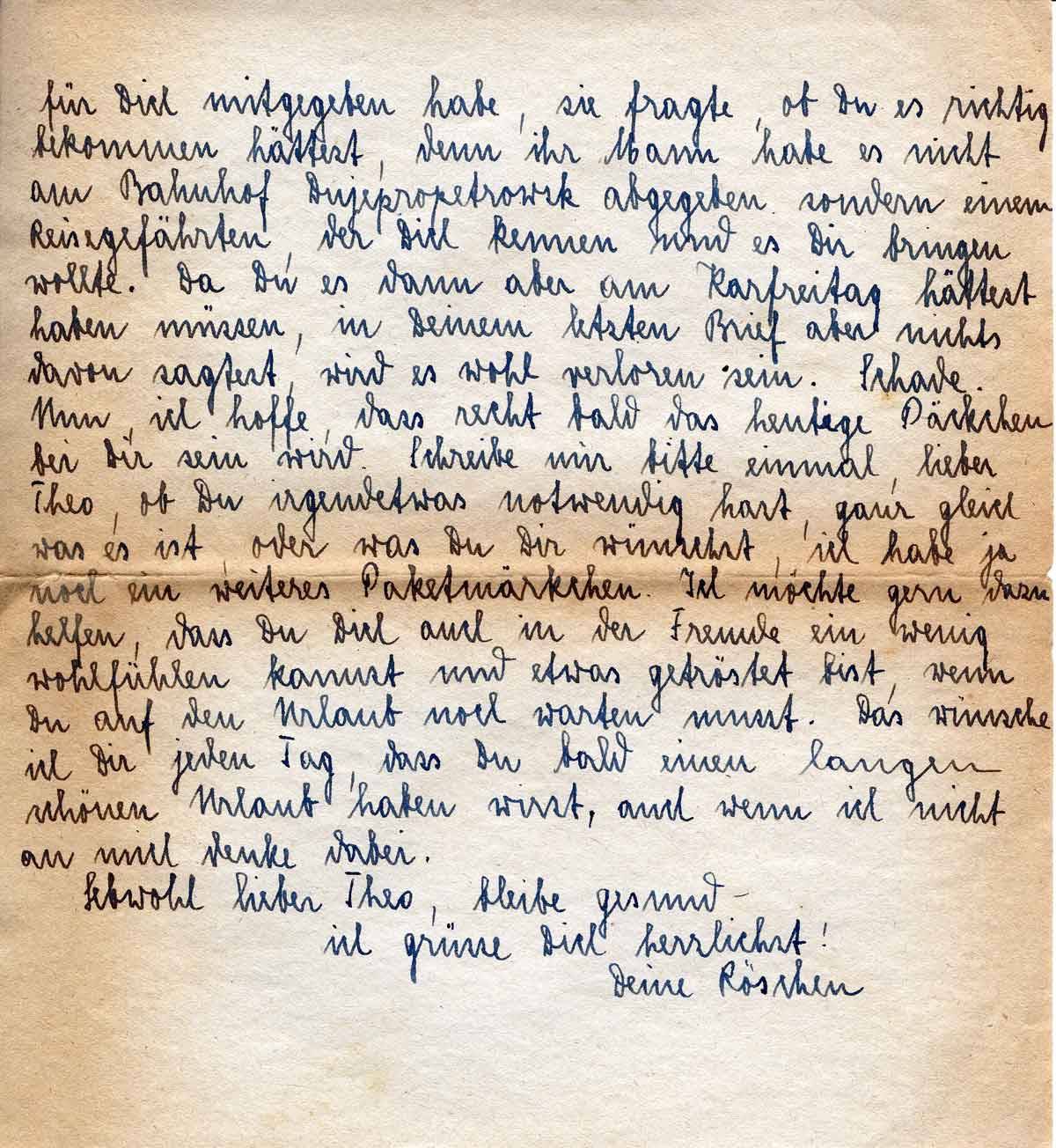 für Dich mitgegeben habe, sie fragte, ob Du es richtig bekommen hättest, denn ihr Mann habe es nicht am Bahnhof in Dnjepropetrowsk abgegeben, sondern einem Reisegefährten, der Dich kennen und es Dir bringen wollte. Da Du es dann aber am Karfreitag hättest haben müssen, in Deinem letzten Brief aber nichts davon sagtest, wird es wohl verloren sein. Schade. Nun, ich hoffe, dass recht bald das heutige Päckchen bei Dir sein wird. Schreibe mir bitte einmal , lieber Theo, ob Du irgendetwas notwendig hast, ganz gleich was es ist, oder was Du Dir wünschst, ich habe ja noch ein weiteres Paketmärkchen .Ich möchte gern dazu helfen, dass Du Dich auch in der Fremde ein wenig wohlfühlen kannst und etwas getröstet bist, wenn Du auf den Urlaub noch warten musst. Das wünsche ich Dir jeden Tag, dass Du bald einen langen, schönen Urlaub haben wirst, auch wenn ich nicht an mich denke dabei.