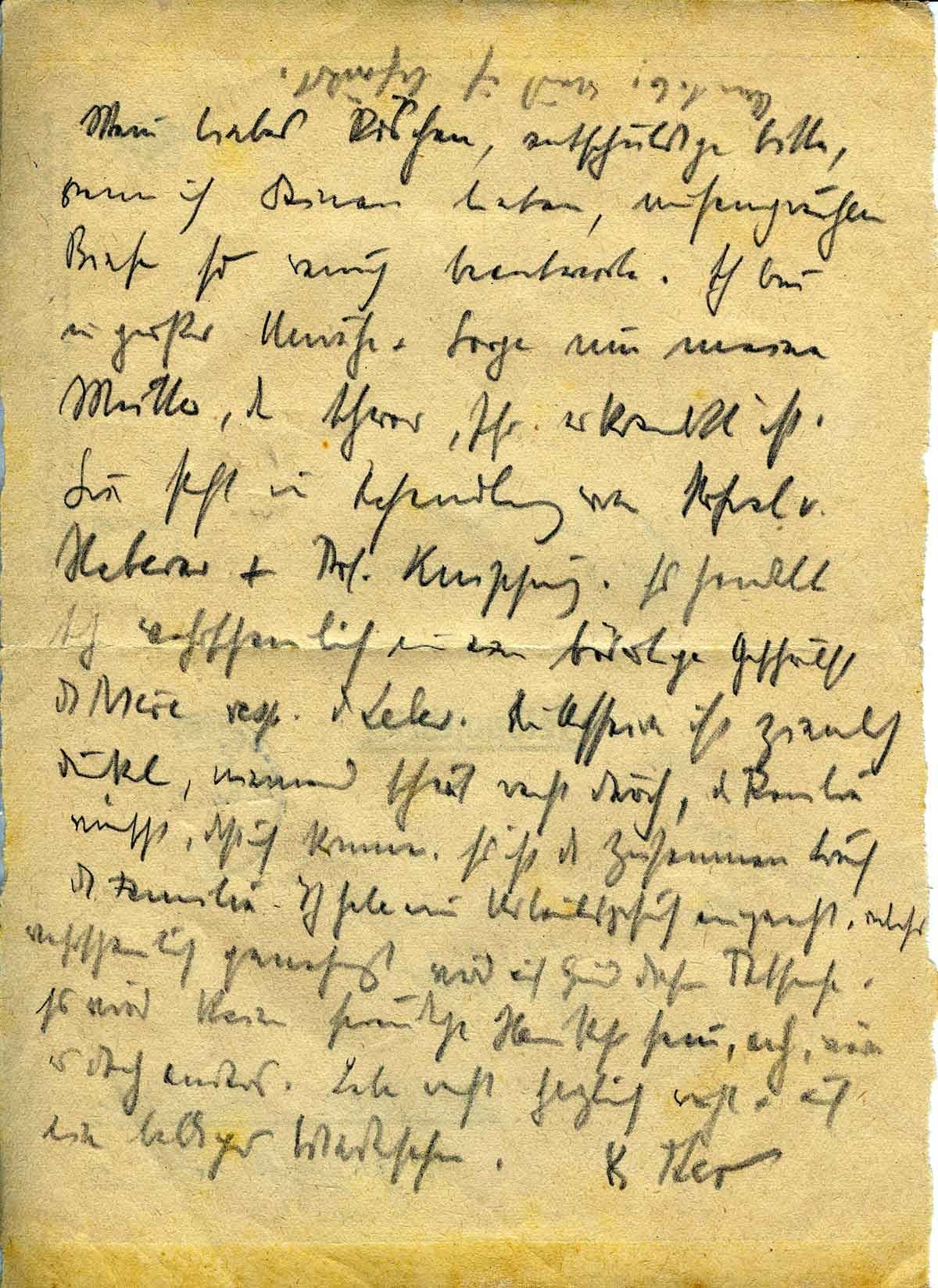 Entschuldige bitte, wenn ich Deine letzten , umfangreichen Briefe so wenig beantworte. Ich bin in großer Unruhe und Sorge um meine Mutter, die schwer, sehr erkrankt ist. Sie steht in Behandlung von Ursel von Haberer + Prof. Knipping. Es handelt sich wahrscheinlich um eine böse Geschwulst der Niere resp. der Leber. Die Affäre ist ziemlich dunkel, niemand schaut recht durch, die Familie wünscht, dass ich komme. Es ist der Zusammenbruch der Familie. Ich habe ein Urlaubsgesuch eingereicht, welches wahrscheinlich genehmigt wird aufgrund dieser Atteste. Es wird keine freudige Heimkehr sein, ach, wäre es doch anders.