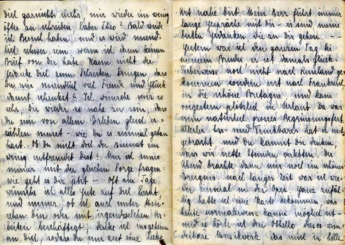 Gestern war ich den ganzen Tag bei meinem Bruder, er ist damals glücklicherweise noch nicht nach Russland gekommen, sondern erst nach Frankreich, in die schöne Bretagne, und er kam vorgestern plötzlich in Urlaub. Da war nun natürlich großes Begrüßungsfest. Allerlei Eß- und Trinkbares hat er mitgebracht, und Du kannst Dir denken, dass wir nette Stunden verlebten. Der Abend brachte dann mir nochein schönes Ereignis: nach langer Zeit war ich wieder einmal in der Oper. Ganz zufällig hatte ich eine Karte bekommen , was heute normalerweise kaum möglich ist. Und so hörte ich den Othello, dieses wunderbare Musikwerk, das mich in helle