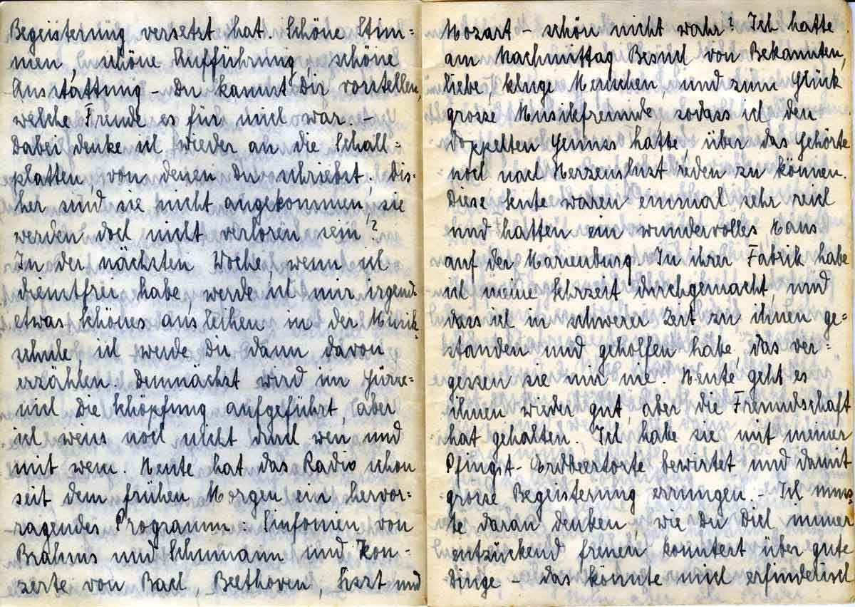 Dabei denke ich wieder an die Schallplatten, von denen du schriebst, bisher sind sie nicht angekommen, sie werden doch nicht verloren sein? In der nächsten Woche, wenn ich dienstfrei habe, werde ich mir irgendwas Schönes ausleihen in der Musikschule, ich werde Dir dann davon erzählen. Demnächst wird im Gürzenich Die Schöpfung aufgeführt, aber ich weiss noch nicht durch wen und mit wem. Heute hat das Radio schon seit dem frühen Morgen einhervorragendes Programm: Sinfonien von Brahms und Schuhmann und Konzerte von Bach, Beethoven, Liszt und