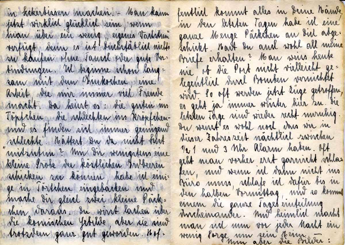 fentlich kommt alles in Deine Hände, in den letzten Tagen habe ich eine ganze Menge Päckchen an Dich ab geschickt. Hast Du auch wohl alle meine Briefe erhalten? Man weiß ja heute nie, ob die Post nicht vielleicht gelegentlich durch Bomben vernichtet wird. So oft werden jetzt Züge getroffen, es geht ja immer wüster hier zu. Die letzten Tage sind wieder recht unruhig. Du weißt es wohl noch, dass wir in dieser Jahreszeit nächtlich zwischen halb eins und drei Uhr Alarm haben. Oft geht man vorher gar nicht erst schlafen, und wenn ich dann nicht ins Büro muss, schlafe ich dafür bis in den halben Vormittag, und so kommt einem die ganze Tageseinteilung durcheinander. Und heimlich macht man sich nun vor jeder Nacht eine wenig Sorge um sein Heim. -
