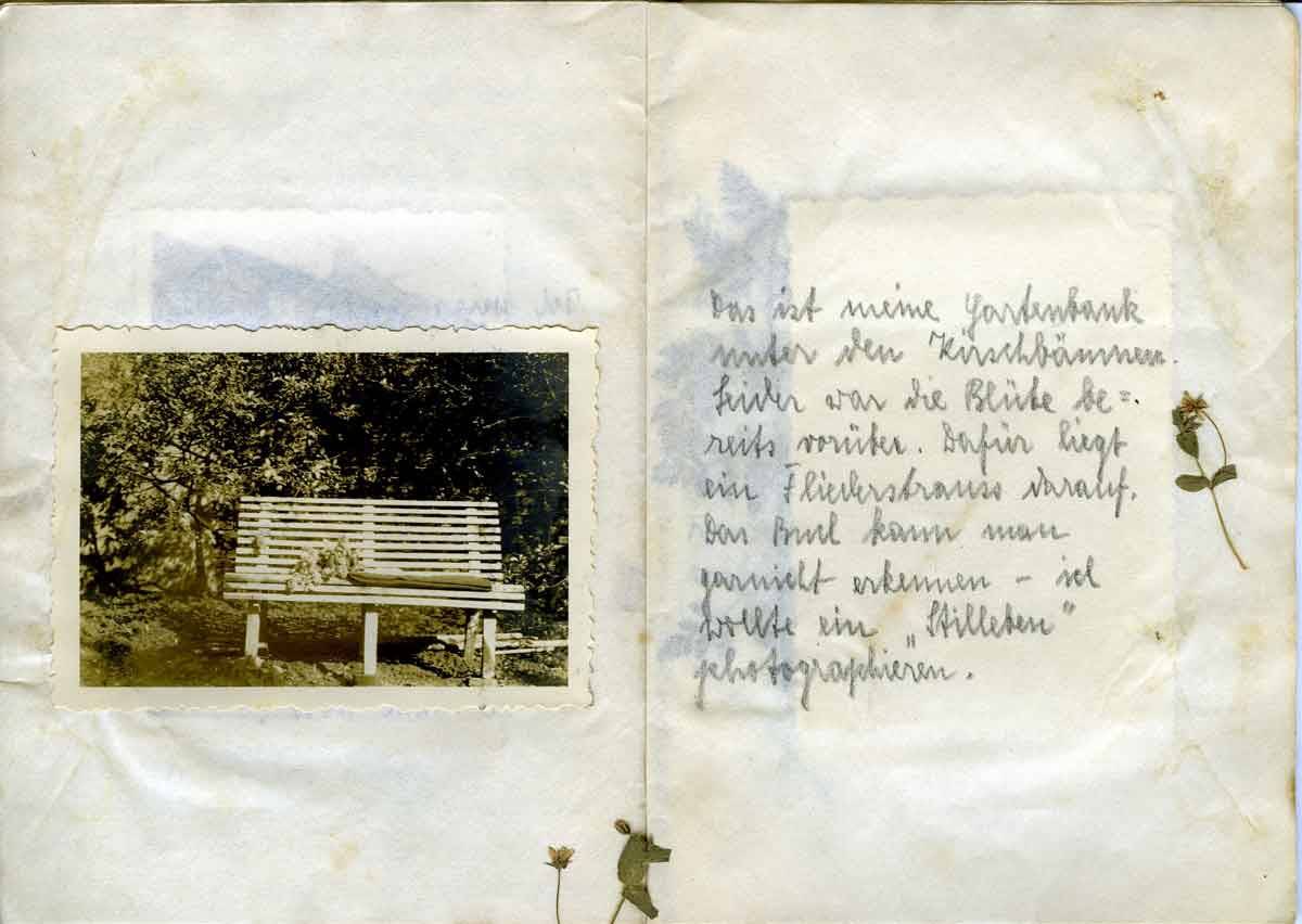 Das ist meine Gartenbank unter den Kirschbäumen. Leider war die Blüte bereits vorüber. Dafür liegt ein Fliederstrauß darauf. Das Buch kann man gar nicht erkennen – ich wollte ein Stilleben fotografieren.
