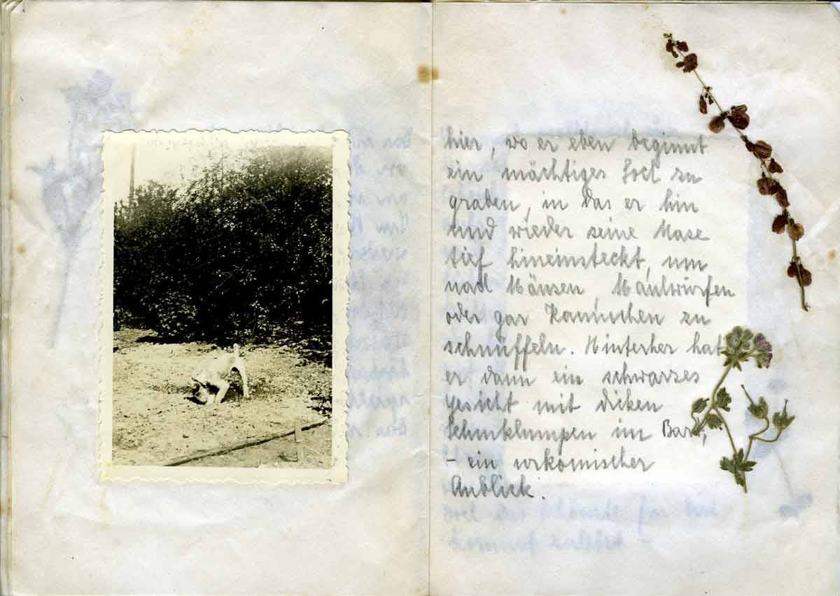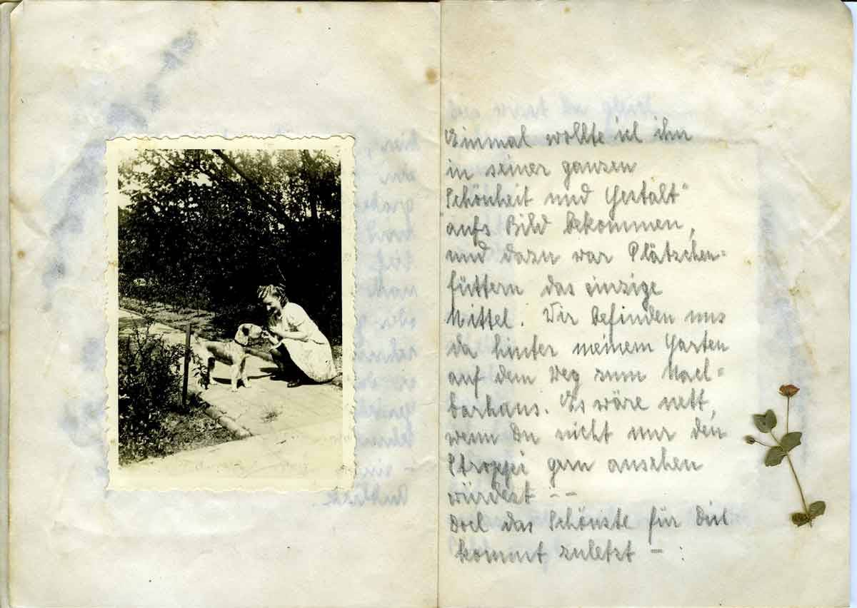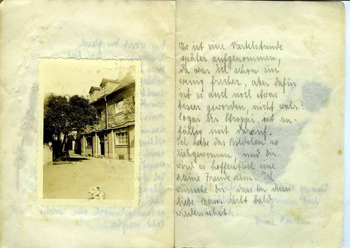 diesmal bekommst Du ein kleines Bilderbuch, vielleicht wird es Dir gefallen. Es sind meine ersten Fotoversuche, die ich an Stroppi und an meiner Umgebung ausgelassen habe. Nachdem ich den ersten Film fast völlig verdorben hatte, sind diese Bildchen aus dem zweiten und dritten schon ganz manierlich geworden, ist es nicht war? Ich binde daraus ein kleines Heftchen für Dich, so ist es mir, als ob ich diese Abendstunden des Pfingstmontag mit Dir verbringe. Beide Feiertag waren recht lebhaft für mich, um so mehr empfinde ich jetzt, wie sehr mir ein Gruß von Dir fehlt. Ich schaue wieder so sehnsüchtig nach Deiner Handschrift aus, und die Zeit wird mir wieder grausam lang. Treibt