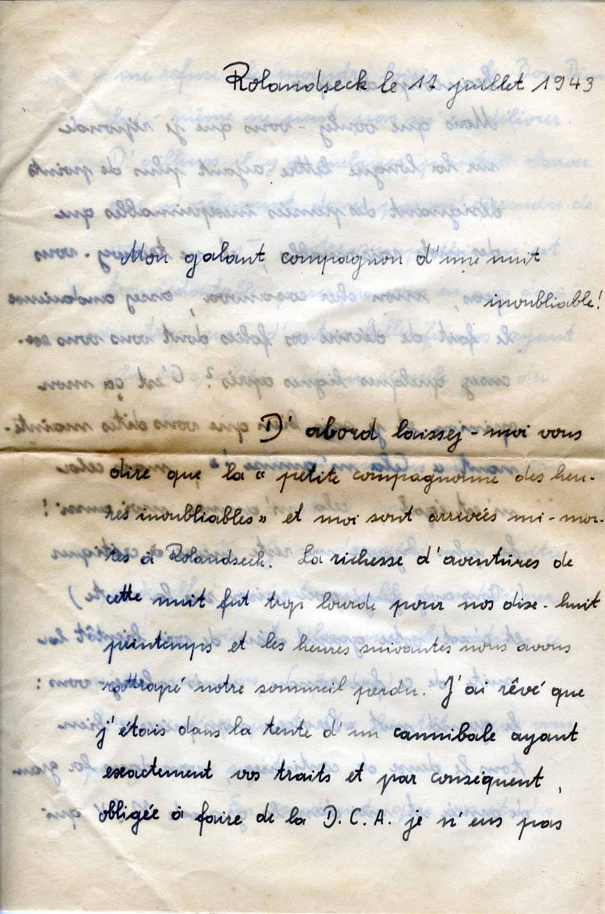 Zunächst möchte ich Ihnen sagen, dass die „kleine Begleiterin der unvergesslichen Stunden“ und ich halbtot in Rolandseck angekommen sind. Die vielen Abenteuer dieser Nacht waren zu schwer für unsere 18 Lenze und in den folgenden Stunden haben wir den fehlenden Schlaf nachgeholt. Ich träumte in dem Zelt eines Kannibalen zu sein, der genau Ihre Züge hatte und daher war ich gezwungen, die Flak zu bedienen, ich hatte nicht