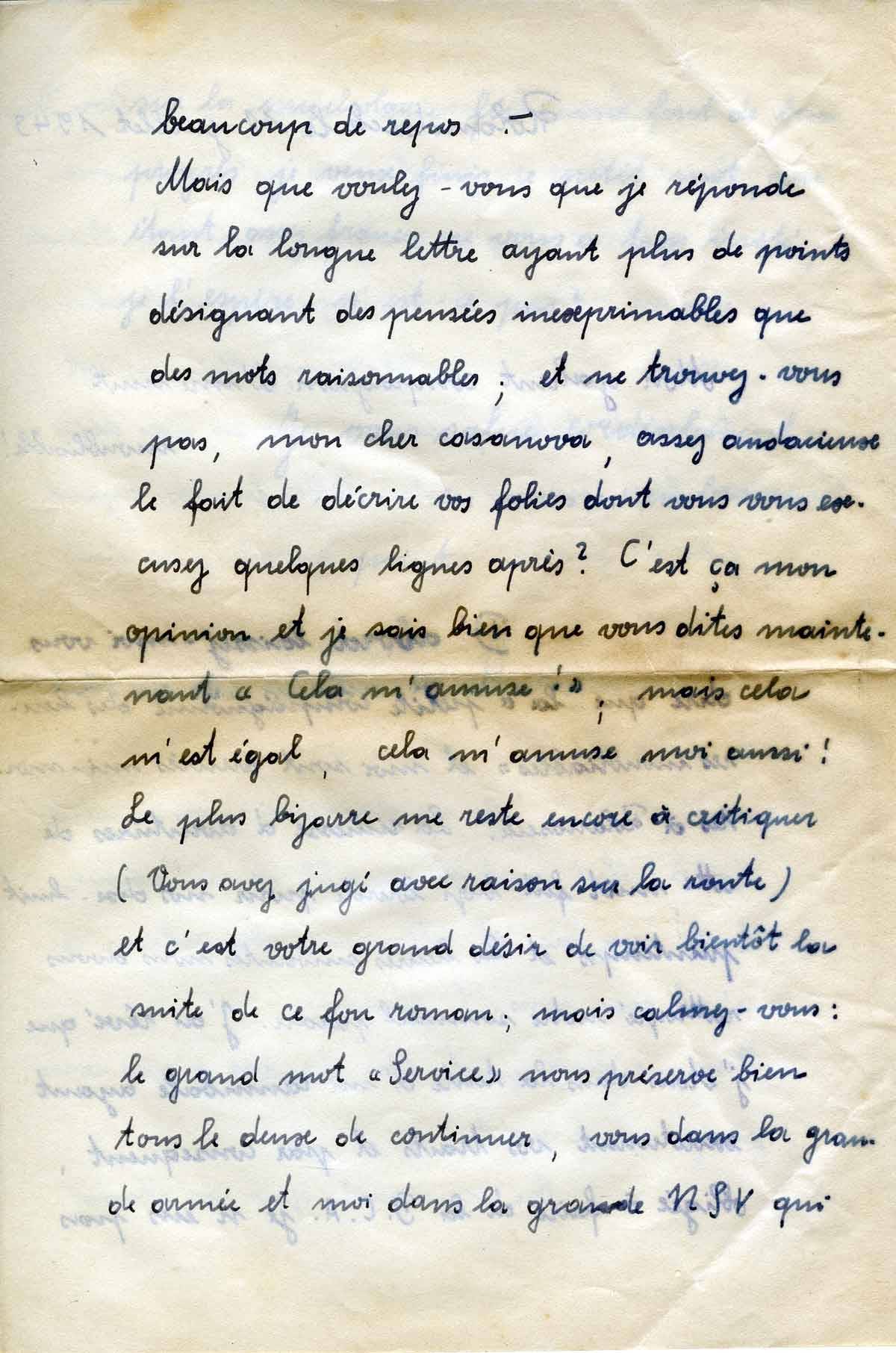 Aber was wollen Sie, dass ich antworte auf den langen Brief mit den bezeichneten Punkten unausdrücklicher Gedanken als vernünftiger Worte; und finden Sie es nicht, mein lieber Casanova, allzu kühn , ihre Verrücktheiten zu beschreiben, um sich dann einige Zeilen später dafür zu entschuldigen? Dies ist meine Meinung und ich weiß genau, was Sie nun sagen „ cela m’amuse!“ (das macht mir Spaß) , aber das ist mir egal, und das macht mir auch Spaß!