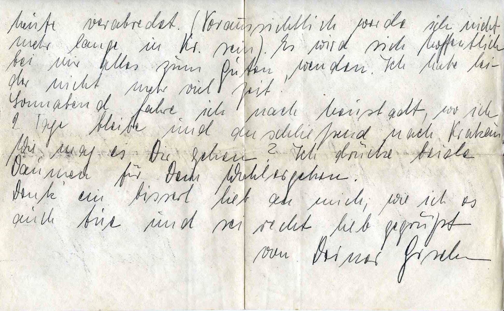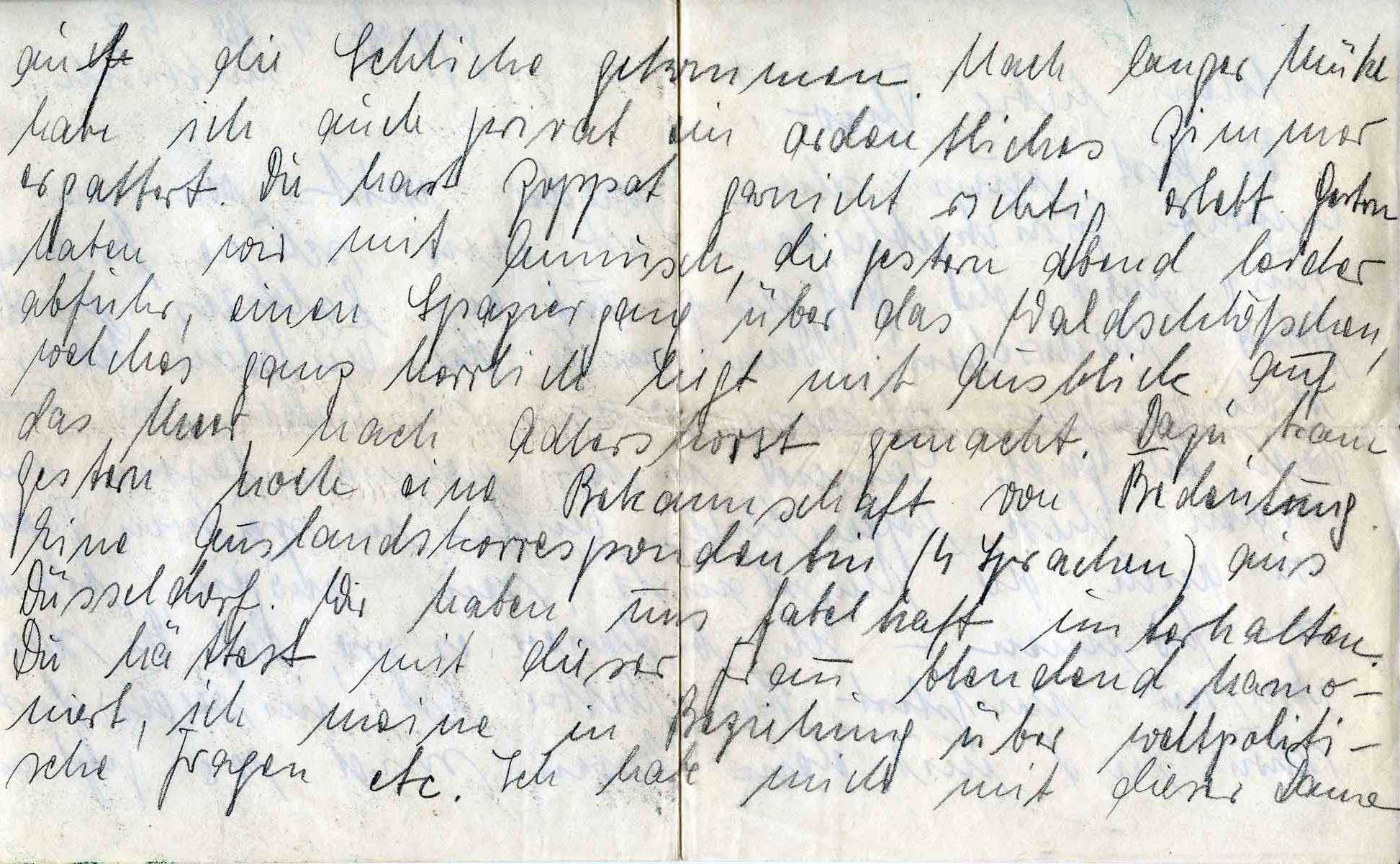 auf die Schliche gekommen. Nach langer Mühe habe ich auch privat ein ordentliches Zimmer ergattert. Du hast Zoppot gar nicht richtig erlebt. Gestern haben wir mit Annusch, die gestern Abend leider abfuhr, einen Spaziergang über das Waldschlösschen, welches ganz herrlich liegt mit Ausblick auf das Meer, nach Adlershorst gemacht. Dazu kam gestern noch eine Bekanntschaft von Bedeutung. Eine Auslandskorrespondentin (4 Sprachen) aus Düsseldorf. Wir haben uns fabelhaft unterhalten.- Du hättest mit dieser Frau blendend harmoniert, ich meine in Beziehung über weltpolitische Fragen etc. Ich habe mich mit dieser Dame