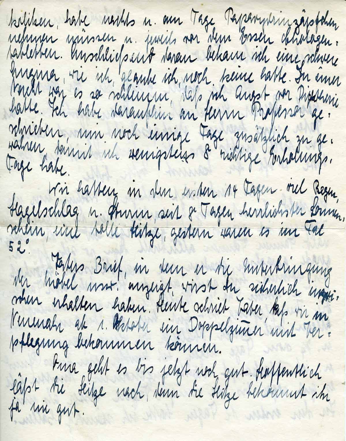 Vaters Brief, in dem er die Unterbringung der Möbel usw. anzeigt, wirst du sicherlich inzwischen erhalten haben. Heute schrieb Vater, daß wir in Neuenahr ab 1. Oktober ein Doppelzimmer mit Verpflegung bekommen können.