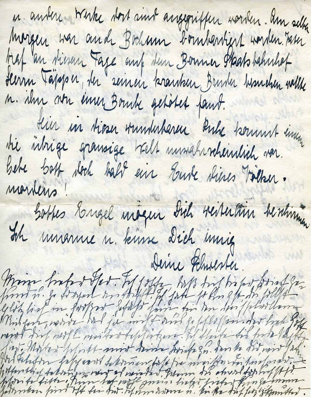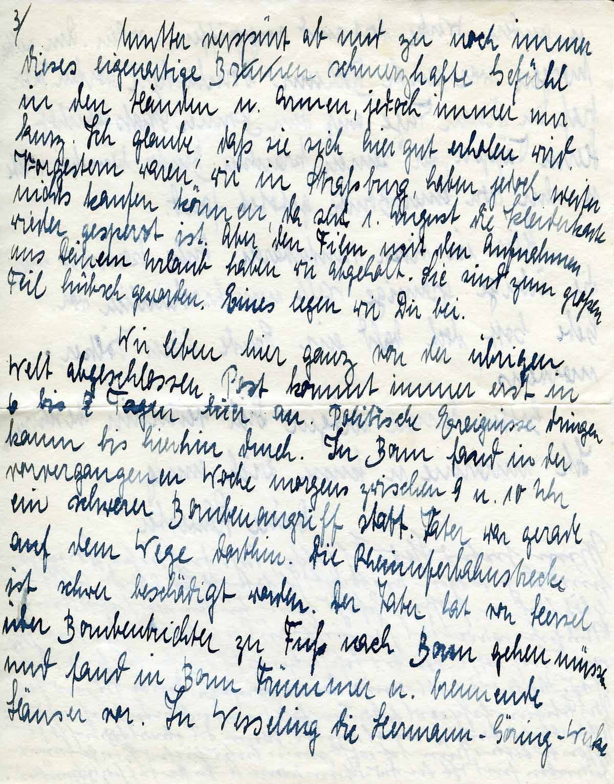 Wir leben hier ganz von der übrigen Welt abgeschlossen. Post kommt immer erst in 6 - 7 Tagen hier an. Politische Ereignisse dringen kaum bis hierhin durch. In Bonn fand in der vergangenen Woche morgens zwischen 9 u. 10 Uhr ein schwerer Bombenangriff statt. Vater war gerade auf dem Wege dorthin. Die Rheinuferbahnstrecke ist schwer beschädigt worden. Der Vater hat von Hersel über Bombentrichter zu Fuß nach Bonn gehen müssen und fand in Bonn Trümmer und brennende Häuser vor.