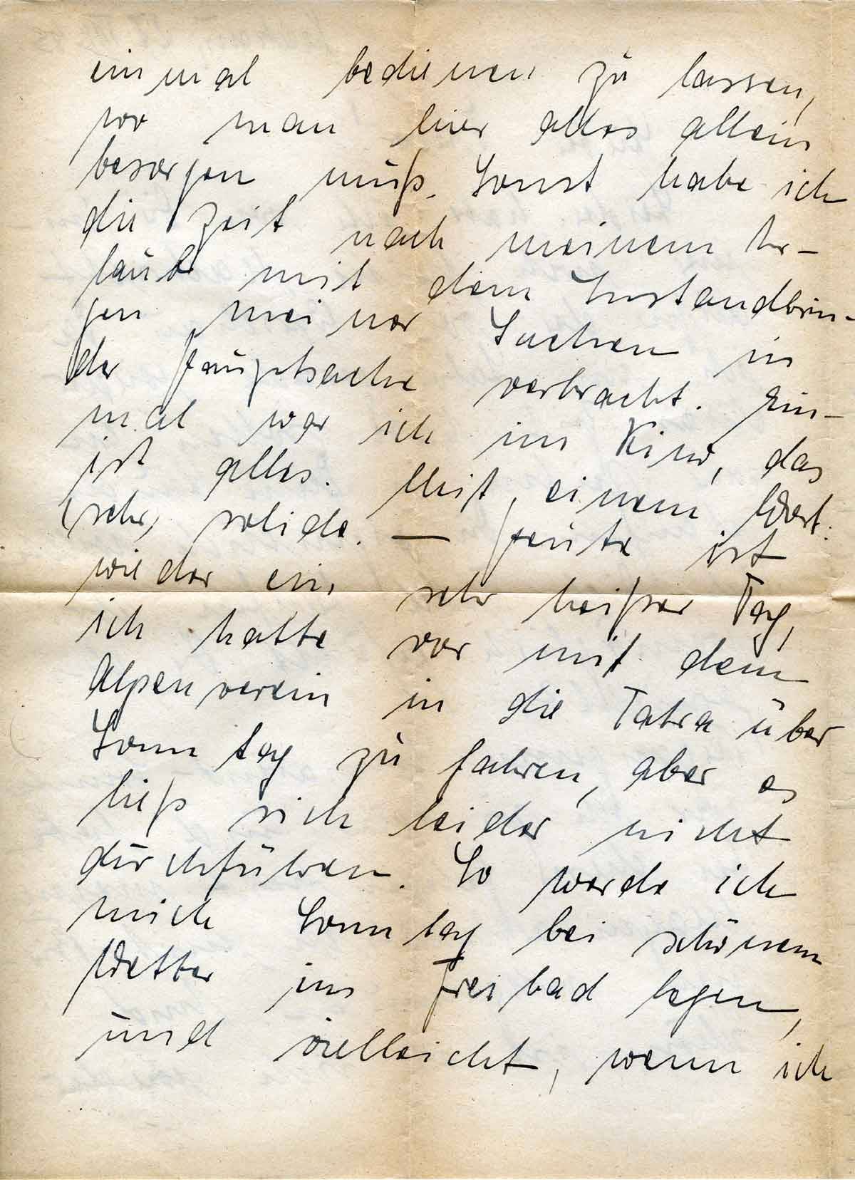 einmal bedienen zu lassen, wo man hier alles allein besorgen muss. Sonst habe ich die Zeit nach meinem Urlaub mit dem Instandbringen meiner Sachen in der Hauptsache verbracht. Einmal war ich im Kino, das ist alles. Mit einem Wort: sehr solide. – Heute ist wieder ein sehr heisser Tag, Ich hatte vor, mit dem Alpenverein in die Tatra über Sonntag zu fahren, aber es ließ sich leider nicht durchführen. So werde ich mich Sonntag bei schönem Wetter ins Freibad legen, und vielleicht, wenn ich