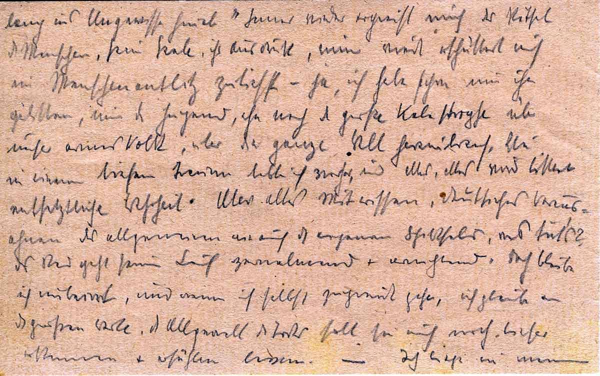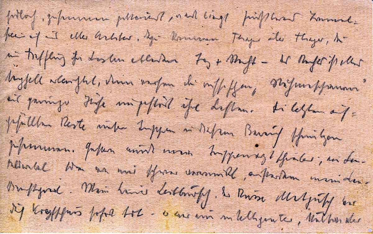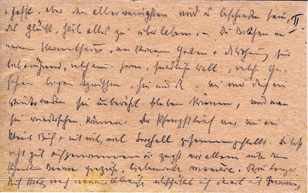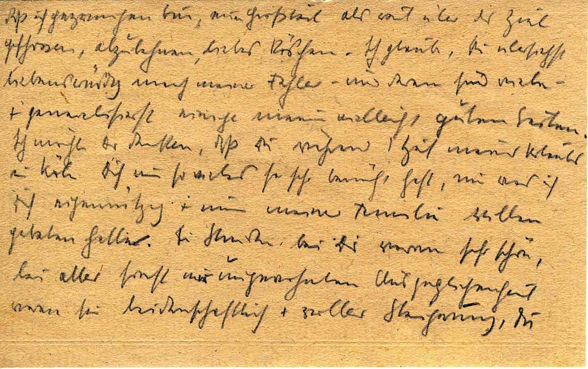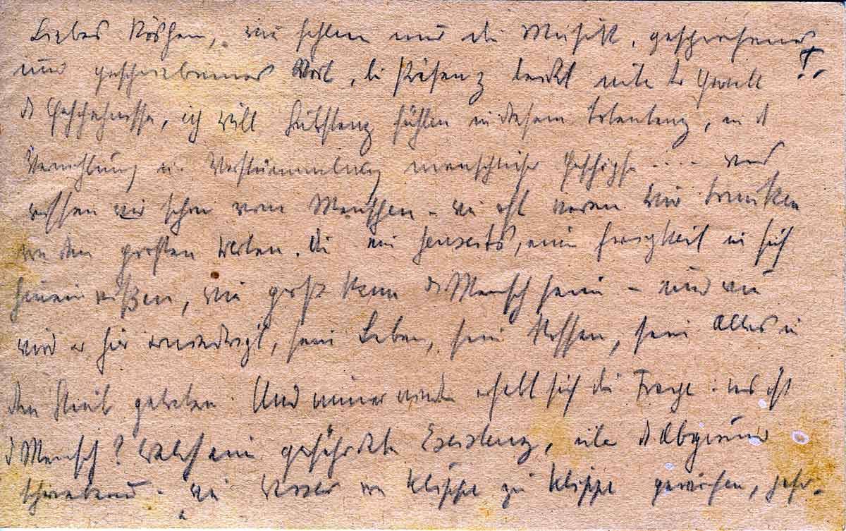 Ich will schließen, liebes Röschen, entschuldige bitte alle schlechten Nebenumstände, ich liege hier in dem Erdloch, schmutzig, heruntergekommen, erschöpft. Habe die Jacke zerrissen mit gossen Löchern, unrasiert, die Haut schwarz und mit Blutkrusten bedeckt.