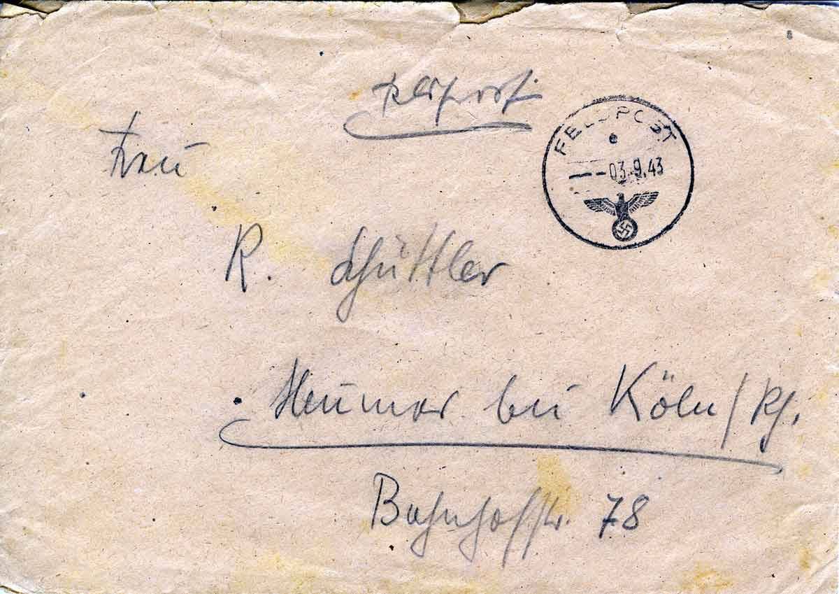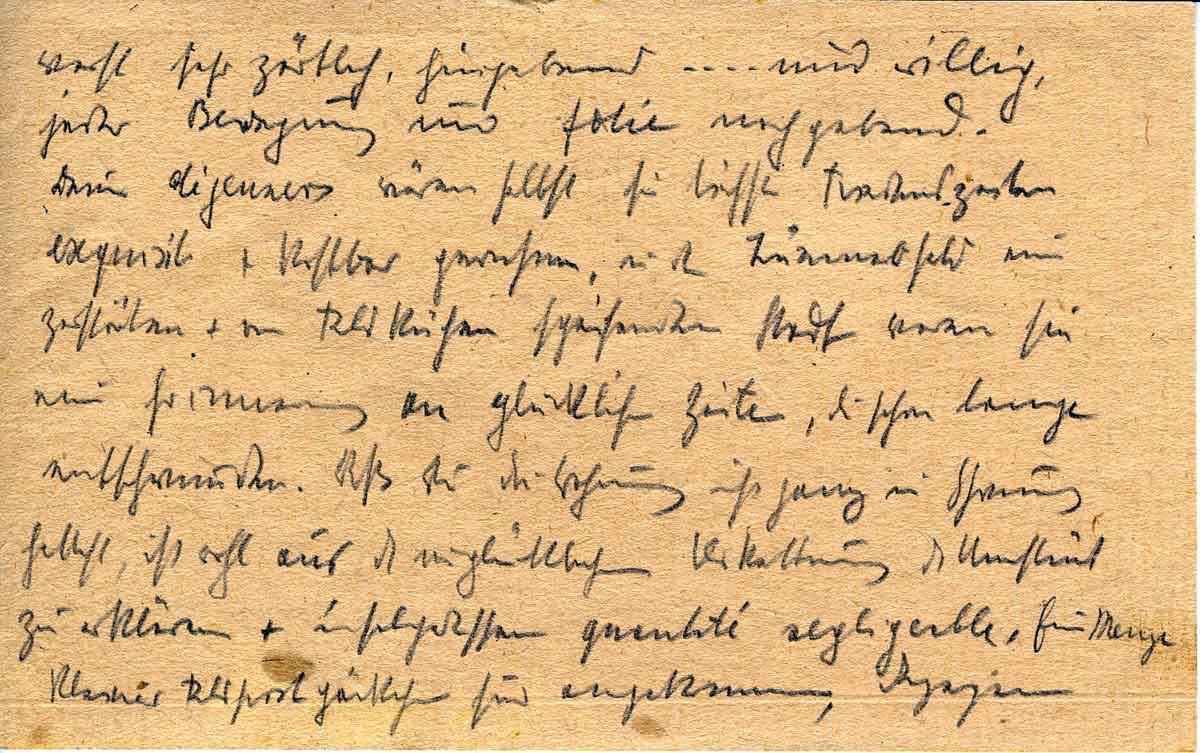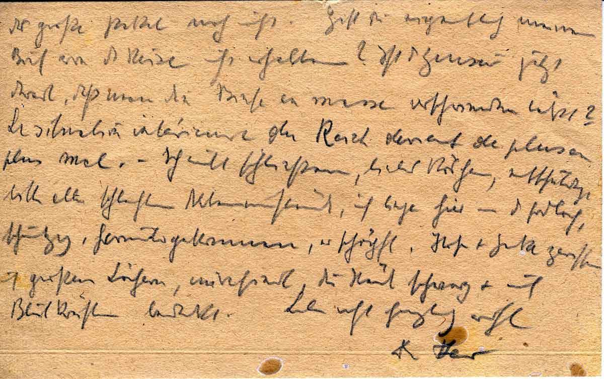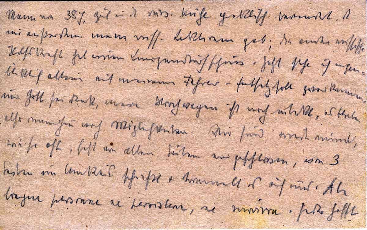 Ich will schließen, liebes Röschen, entschuldige bitte alle schlechten Nebenumstände, ich liege hier in dem Erdloch, schmutzig, heruntergekommen, erschöpft. Habe die Jacke zerrissen mit gossen Löchern, unrasiert, die Haut schwarz und mit Blutkrusten bedeckt.