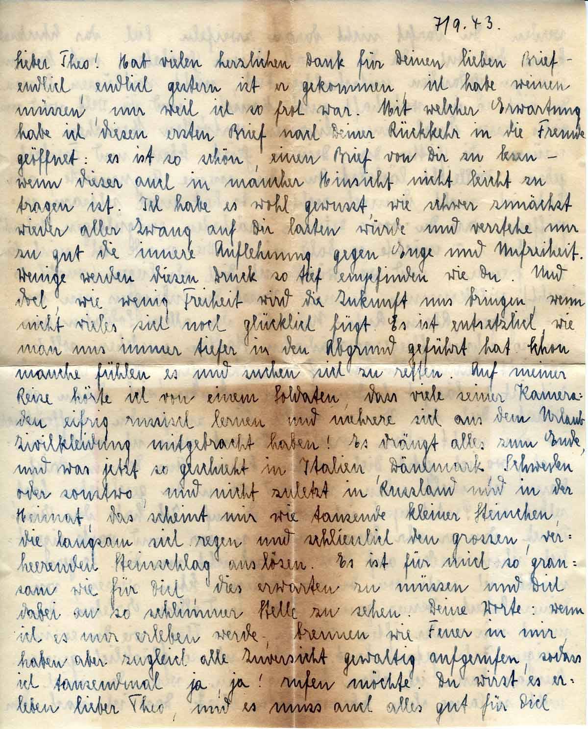 Es drängt alles zum Ende, und was jetzt geschieht in Italien, Dänemark, Schweden oder sonstwo, und nicht zuletzt in Rußland und in der Heimat, das scheint mir wie tanzende kleine Steinchen, die langsam sich regen und schließlich den großen, verheerenden Steinschlag auslösen. Es ist für mich so grausam wie für Dich, dies erwarten zu müssen und Dich dabei an so schlimmer Stelle zu sehen. Deine Worte: „wenn ich es nur erleben werde“ -brennen wie Feuer in mir, haben aber zugleich alle Zuversicht gewaltig aufgerufen, sodass ich tausendmal ja, ja ! rufen möchte. Du wirst es erleben, lieber Theo, und es muß auch alles gut für Dich