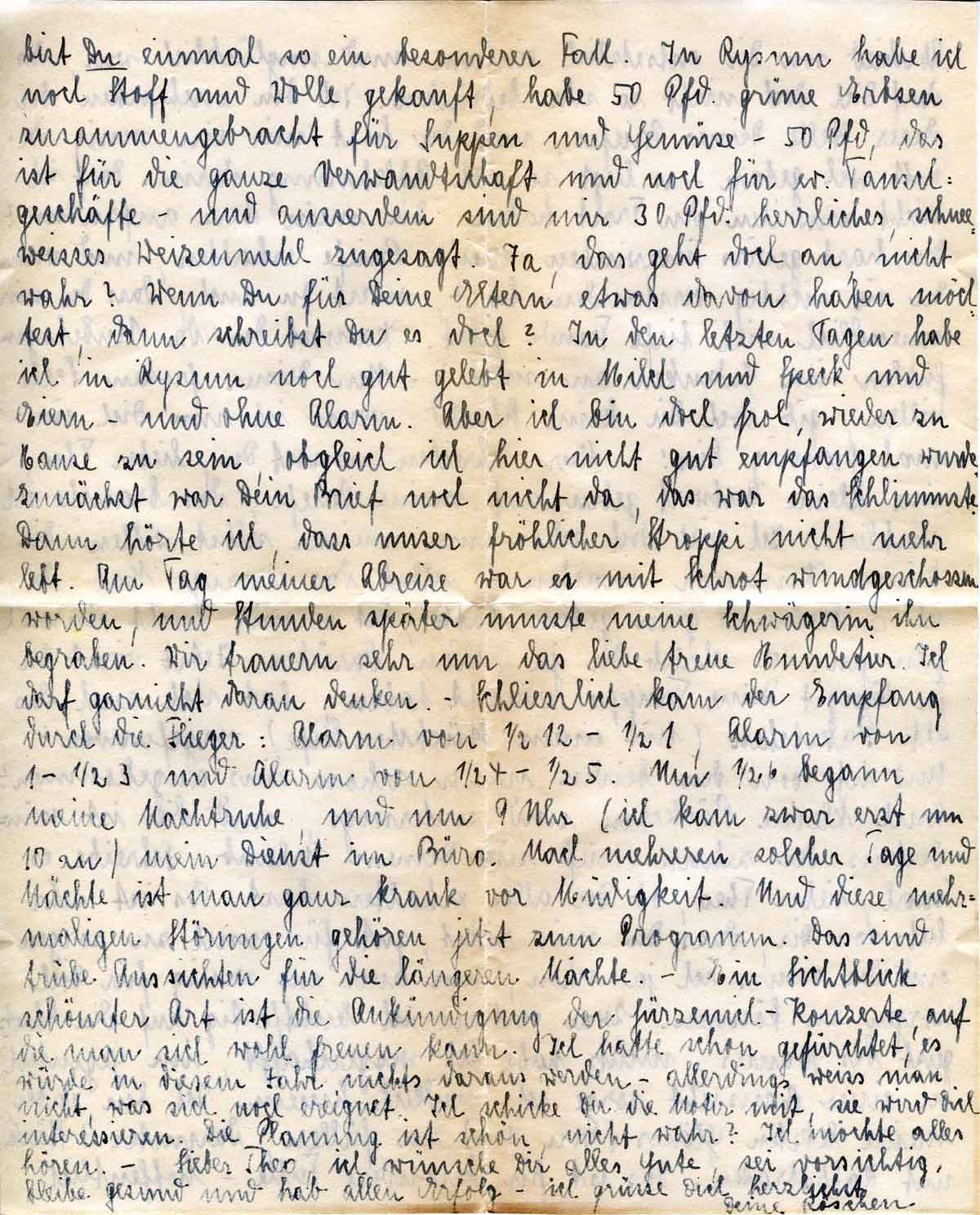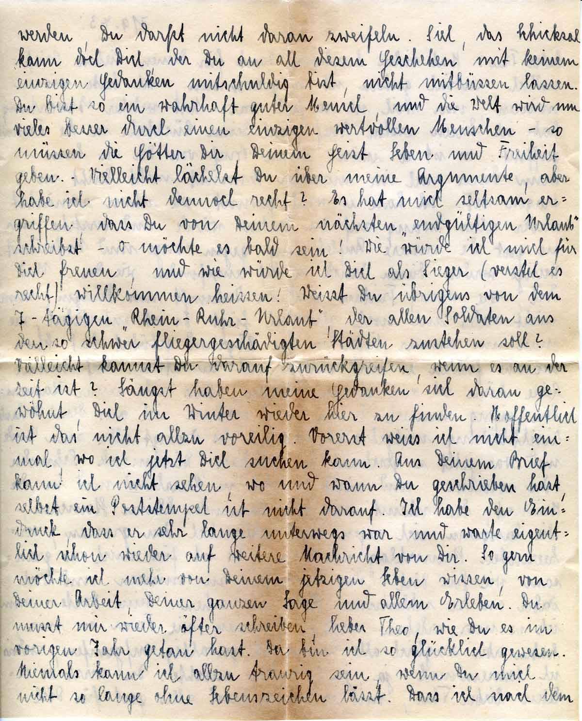 Es hat mich seltsam ergriffen, dass Du von Deinem nächsten „endgültigen Urlaub“ schreibst - o möchte es bald sein! Wie würde ich mich für Dich freuen, und wie würde ich Dich als Sieger (versteh es recht) willkommen heißen! Weißt Du übrigens von dem 7-tägigen „Rhein-Ruhr-Urlaub“, der allen Soldaten aus den so schwer fliegergeschädigten Städten zustehen soll? Vielleicht kannst Du darauf zurückgreifen, wenn es an der Zeit ist? Längst haben sich meine Gedanken daran gewöhnt, Dich im Winter wieder hier zu finden. Hoffentlich ist das nicht allzu voreilig. Vorerst weiß ich nicht einmal, wo ich Dich jetzt suchen kann.