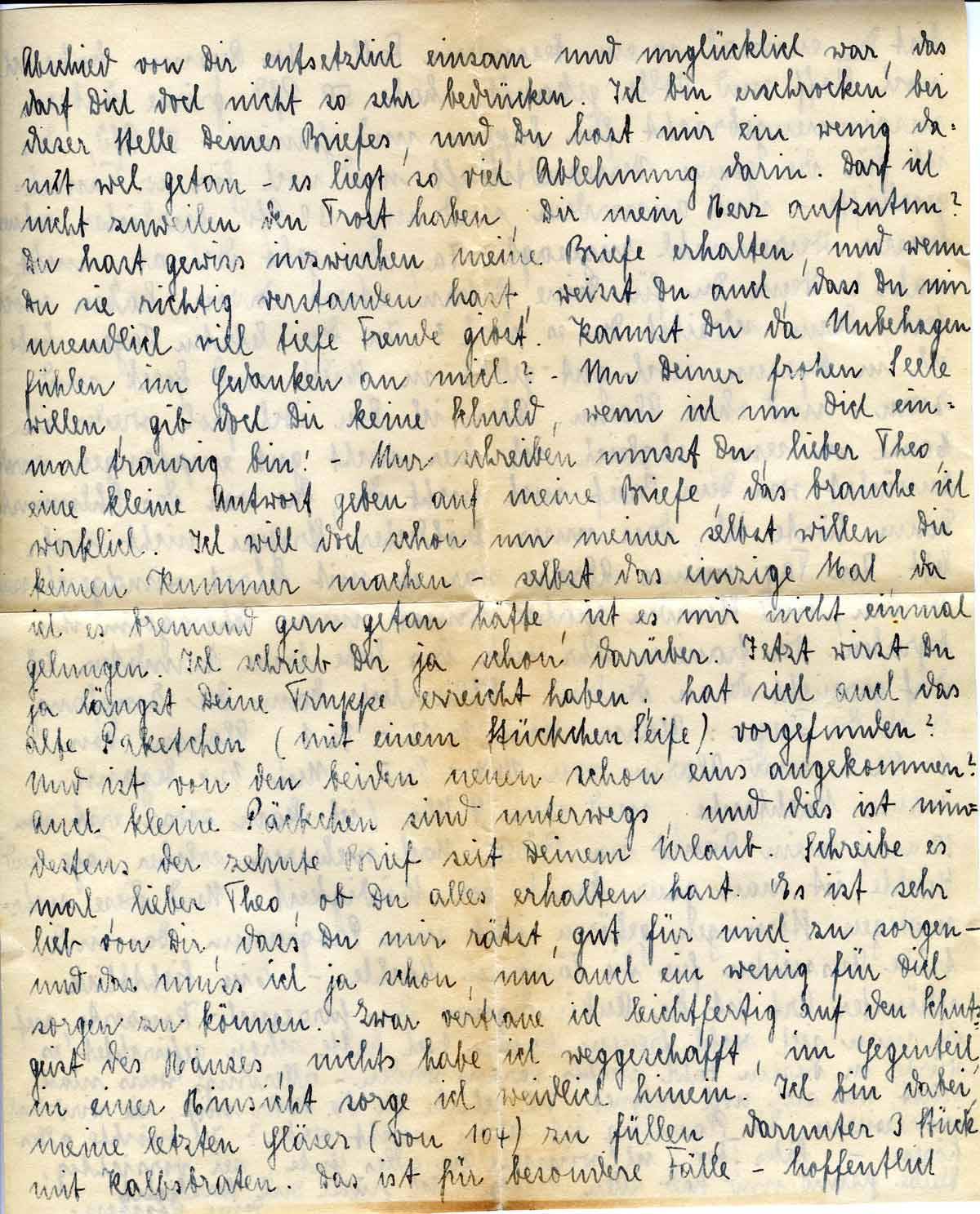 Abschied von Dir entsetzlich einsam und unglücklich war, das darf Dich doch nicht so bedrücken. Ich bin erschrocken bei dieser Stelle Deines Briefes, und Du hast mir ein wenig damit weh getan – es liegt so viel Ablehnung darin. Darf ich nicht zuweilen den Trost haben, Dir mein Herz aufzutun? Du hast gewiss inzwischen meine Briefe erhalten, und wenn Du sie richtig verstanden hast, weißt Du auch, dass Du mir unendlich viel Freude gibst. Kannst Du da Unbehagen fühlen in Gedanken an mich? - Um Deiner frohen Seele willen, gib doch Dir keine Schuld, wenn ich um Dich einmal traurig bin! – Nur schreiben musst Du, lieber Theo, eine kleine Antwort geben auf meine Briefe, das brauche ich wirklich. Ich will doch schon um meiner selbst willen Dir keinen Kummer machen – selbst das einzige Mal, da ich es besonders gern getan hätte, ist es mir nicht einmal gelungen. Ich schrieb Dir ja schon darüber. Jetzt wirst Du ja längst Deine Truppe erreicht haben, hat sich auch das alte Paketchen (mit einem Stückchen Seife) vorgefunden? Und ist von den beiden Neuen schon etwas angekommen? Auch kleine Päckchen sind unterwegs, und dies ist mindestens der zehnte Brief seit Deinem Urlaub. Schreibe es mal, lieber Theo, ob Du alles erhalten hast.