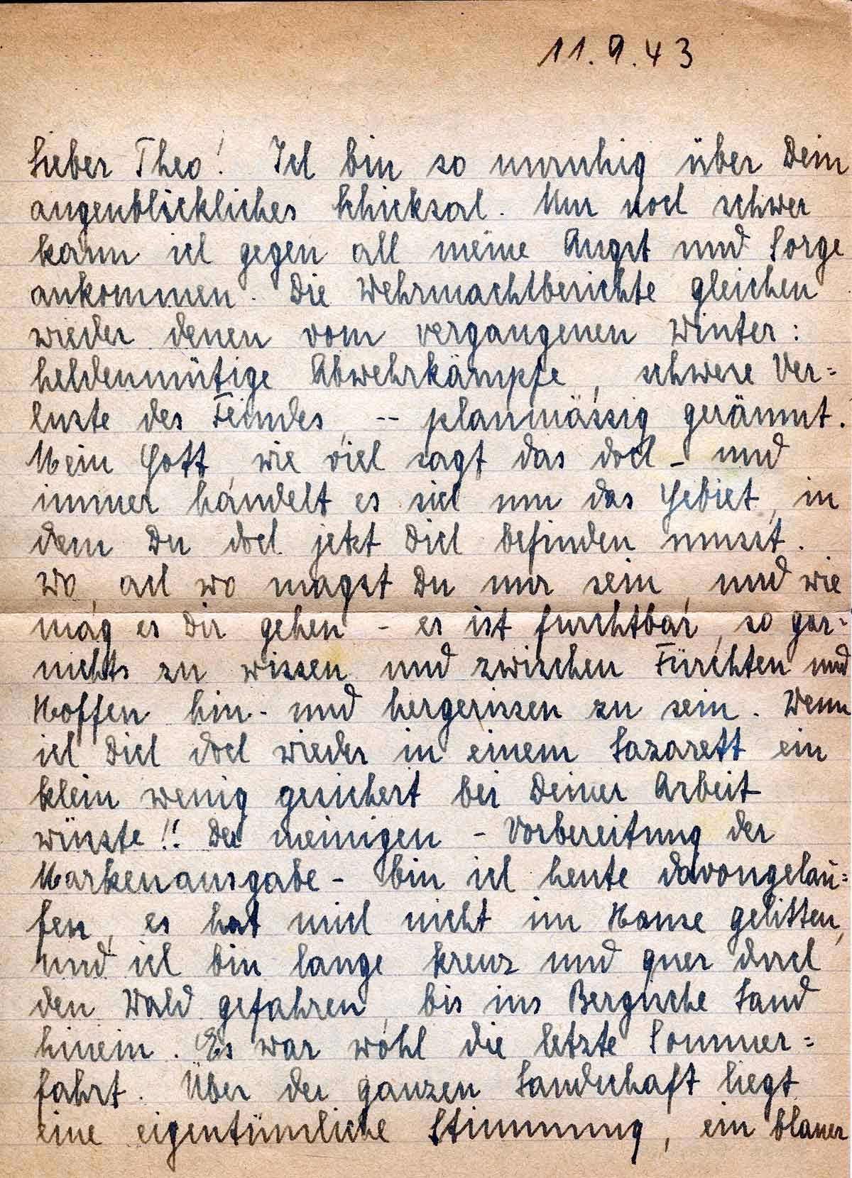 Ich bin so unruhig über Dein augenblickliches Schicksal. Nur noch schwer kann ich gegen all meine Angst und Sorge ankommen. Die Wehrmachtberichte gleichen wieder denen vom vergangenen Winter: heldenmütige Abwehrkämpfe, schwere Verluste des Feindes,... planmäßig geräumt. Mein Gott, wie viel sagt das doch und immer handelt es sich um das Gebiet, in dem Du doch jetzt Dich befinden musst. Wo, ach wo magst Du nur sein, und wie mag es Dir gehen - es ist furchtbar, so gar nichts zu wissen und zwischen Fürchten und Hoffen hin- und hergerissen zu sein. Wenn ich Dich doch wieder in einem Lazarett ein klein wenig gesichert bei Deiner Arbeit wüsste!! Der meinigen - Vorbereitung der Markenausgabe - bin ich heute davongelaufen, es hat mich nicht im Hause gelitten, und ich bin lange kreuz und quer durch den Wald gefahren, bis ins Bergische Land hinein. Es war wohl die letzte Sommerfahrt. Über der ganzen Landschaft liegt eine eigentümliche Stimmung, ein blauer