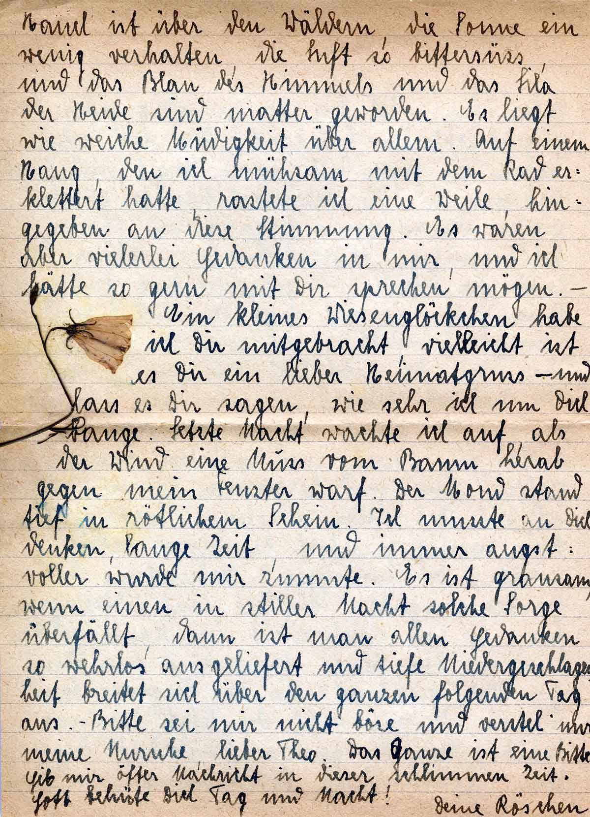 Hauch ist über den Wäldern, die Sonne ein wenig verhalten, die Luft so bittersüß, und das Blau des Himmels und das Lila der Heide sind matter geworden. Es liegt wie weiche Müdigkeit über allem. Auf einem Hang, den ich mühsam mit dem Rad erklettert hatte, rastete ich eine Weile, hingegeben an diese Stimmung. Es waren aber vielerlei Gedanken in mir, und ich hätte so gern mit Dir sprechen mögen. - Ein kleines Wiesenglöckchen habe ich Dir mitgebracht, vielleicht ist es Dir ein lieber Heimatgruß - und lass es Dir sagen, wie sehr ich um Dich bange. Letzte Nacht wachte ich auf, als der Wind eine Nuss vom Baum herab gegen mein Fenster warf. Der Mond stand tief in rötlichem Schein. Ich musste an Dich denken, lange Zeit , und immer angstvoller wurde mir zumute. Es ist grausam, wenn einen in stiller Nacht solche Sorge überfällt, dann ist man allen Gedanken so wehrlos ausgeliefert und tiefe Niedergeschlagenheit breitet sich über den ganzen folgenden Tag aus. - Bitte sei mir nicht böse und versteh’ nur meine Unruhe, lieber Theo. Das ganze ist eine Bitte: Gib mir öfter Nachricht in dieser schlimmen Zeit.
