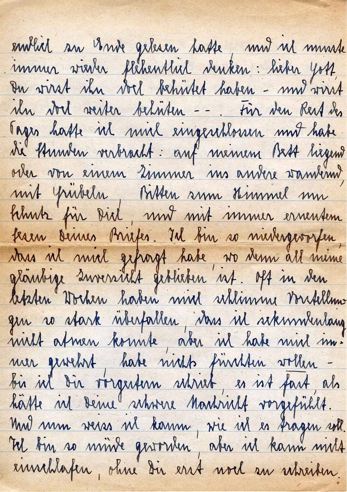 endlich zu Ende gelesen hatte, und ich musste immer wieder flehentlich denken: lieber Gott, Du wirst ihn doch behütet haben - und wirst ihn doch weiter behüten---. Für den Rest des Tages hatte ich mich eingeschlossen und habe die Stunden verbracht: auf meinem Bett liegend oder von einem Zimmer ins andere wandernd mit Grübeln, Bitten zum Himmel um Schutz für Dich, und mit immer erneutem Lesen Deines Briefes. Ich bin so niedergeworfen, dass ich mich gefragt habe, wo denn all meine gläubige Zuversicht geblieben ist. Oft in den letzten Wochen haben mich schlimme Vorstellungen so stark überfallen, dass ich sekundenlang nicht atmen konnte, aber ich habe mich immer gewehrt, habe mich nicht fürchten wollen - bis ich Dir vorgestern schrieb, es ist fast, als hätte ich Deine schwere Nachricht vorgefühlt. Und nun weiß ich kaum, wie ich es tragen soll. Ich bin so müde geworden, aber ich kann nicht einschlafen, ohne Dir erst noch zu schreiben.