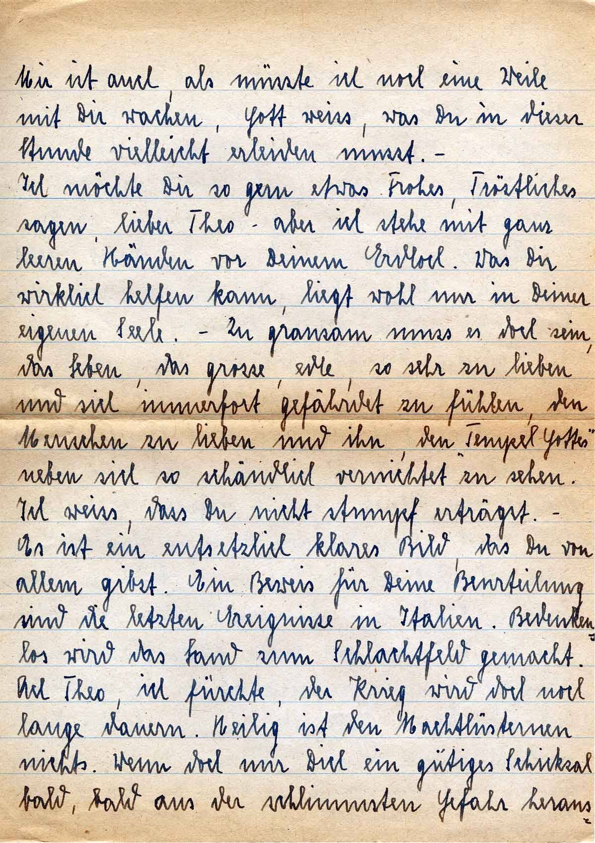 Ich möchte Dir so gern etwas Frohes, Tröstliches sagen, lieber Theo - aber ich stehe mit ganz leeren Händen vor Deinem Erdloch. Was Dir wirklich helfen kann, liegt wohl nur in Deiner eigenen Seele. - Zu grausam muss es doch sein, das Leben, das große, edle, so sehr zu lieben und sich immerfort gefährdet zu fühlen, den Menschen zu lieben und ihn , den „Tempel Gottes“ neben sich so schändlich vernichtet zu sehen. Ich weiß, dass Du nicht stumpf erträgst.- Es ist ein entsetzlich klares Bild, das Du von allem gibst. Ein Beweis für Deine Beurteilung sind die letzten Ereignisse in Italien. Bedenkenlos wird das Land zum Schlachtfeld gemacht. Ach Theo, ich fürchte, der Krieg wird doch noch lange dauern. Heilig ist den Machtlüsternen nichts. Wenn doch Dich ein gütiges Schicksal bald, bald aus der schlimmsten Gefahr heraus