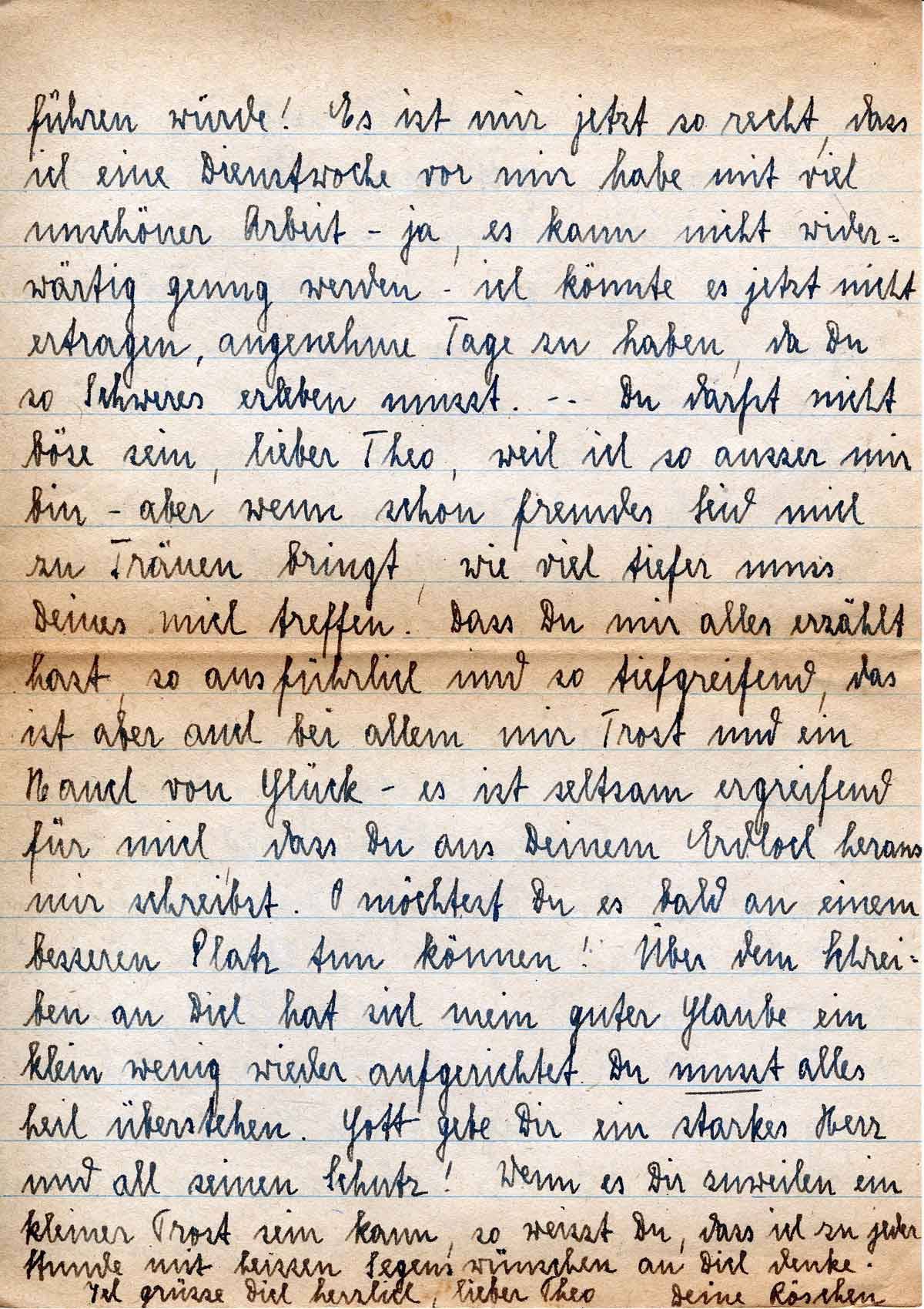Du darfst nicht böse sein, lieber Theo, weil ich so außer mir bin - aber wenn schon fremdes Leid mich zu Tränen bringt, wie viel tiefer muss Deines mich treffen. Dass Du mir alles erzählt hast, so ausführlich und so tiefgreifend, das ist aber auch bei allem mir Trost und ein Hauch von Glück - es ist seltsam ergreifend für mich, dass Du aus Deinem Erdloch heraus mir schreibst. O möchtest Du es bald an einem besseren Platz tun können! Über dem Schreiben an Dich hat sich mein guter Glaube ein klein wenig wieder aufgerichtet. Du musst alles heil überstehen. Gott gebe Dir ein starkes Herz und all seinen Schutz! Wenn es Dir zuweilen ein kleiner Trost sein kann, so weißt Du, dass ich zu jeder Stunde mit heißen Segenwünschen an Dich denke.