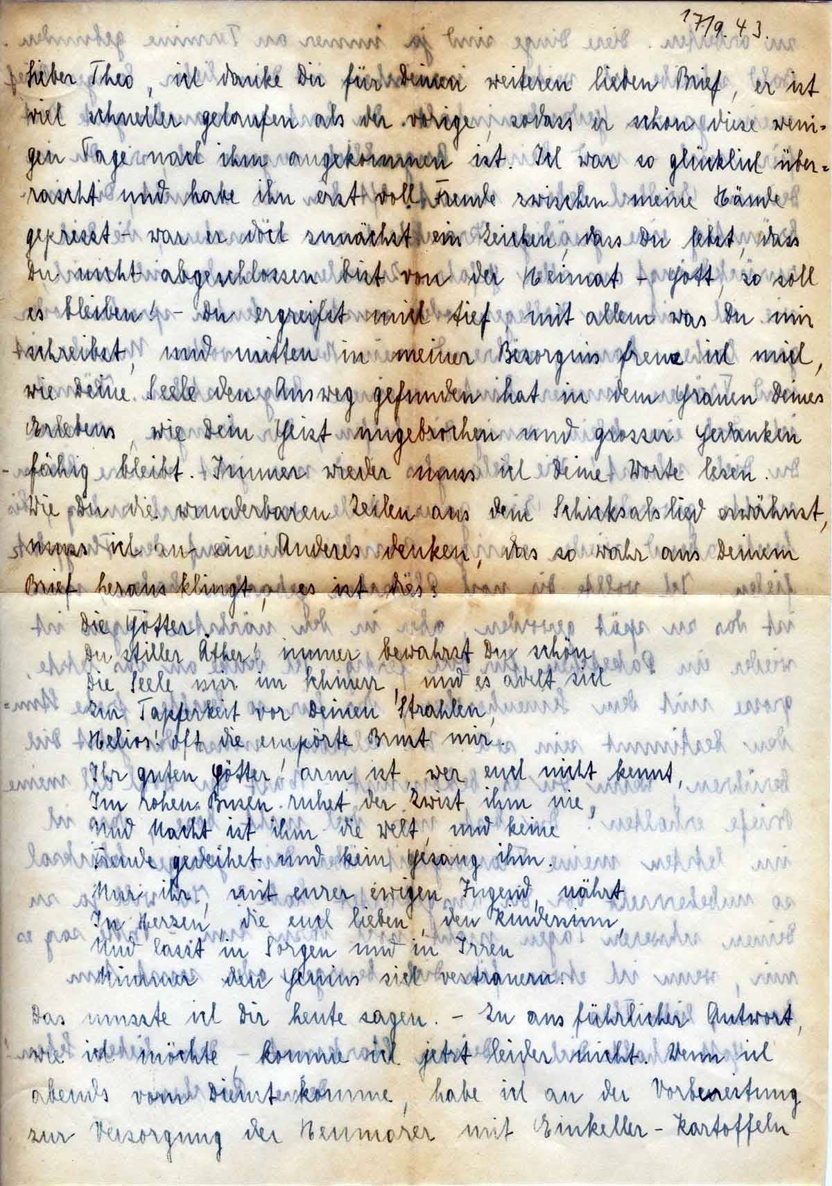 ich danke Dir für Deinen weiteren lieben Brief, er ist viel schneller gelaufen als der vorige, so dass er schon diese wenigen Tage nach ihm angekommen ist. Ich war so glücklich überrascht und habe ihn erst vor Freude zwischen meine Hände gepresst - war er doch zunächst ein Zeichen, dass Du lebst, dass Du nicht abgeschlossen bist von der Heimat - Gott, so soll es bleiben! - Du ergreifst mich tief, mit allem, was Du mir schreibst, und mitten in meiner Besorgnis freue ich mich, wie Deine Seele den Ausweg gefunden hat in dem Grauen Deines Erlebens, wie Dein Geist ungebrochen und großer Gedanken fähig bleibt. Immer wieder muß ich Deine Worte lesen. Wie Du die wunderbaren Zeilen aus dem Schicksalslied erwähnst, muss ich an ein anderes denken, das so wahr aus Deinem Brief heraus klingt, es ist dies:
