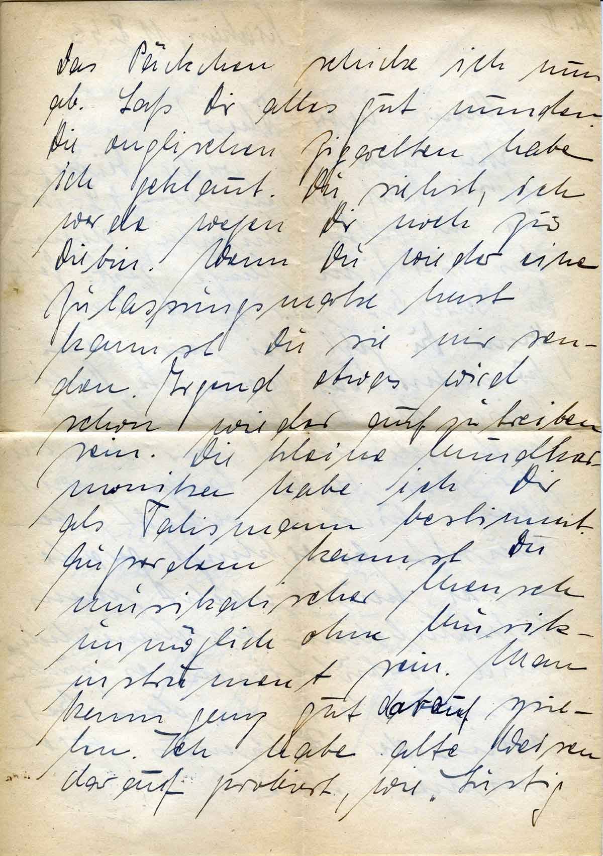 Das Päckchen schicke ich nun ab. Lass Dir alles gut munden. Die englischen Zigaretten habe ich geklaut. Du siehst, ich werde wegen Dir noch zur Diebin. Wenn Du wieder eine Zulassungsmarke hast, kannst Du sie mir senden. Irgendetwas wird schon wieder aufzutreiben sein. Die kleine Mundharmonika habe ich Dir als Talisman bestimmt. Außerdem kannst Du musikalischer Mensch unmöglich ohne Musikinstrument sein. Man kann ganz gut darauf spielen. Ich habe alte Weisen darauf probiert, wie „Lustig