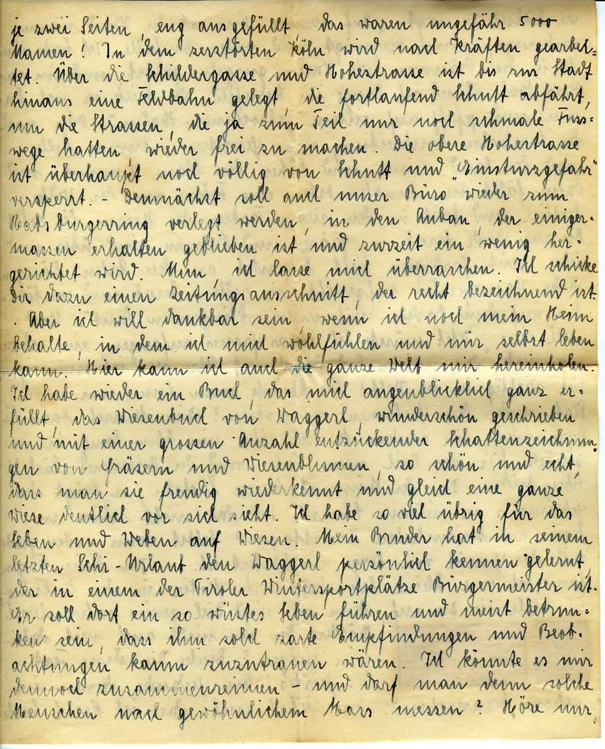 Aber ich will dankbar sein, wenn ich noch mein Heim behalte, in dem ich mich wohlfühlen und mir selbst leben kann. Hier kann ich auch die ganze Welt mir heimholen. Ich habe wieder ein Buch, das mich augenblicklich ganz erfüllt, das Wiesenbuch von Waggerl, wunderschön geschrieben und mit einer großen Anzahl entzückender Schattenzeichnungen von Gräsern und Wiesenblumen, so schön und echt, dass man sie freudig wiedererkennt und gleich eine ganze Wiese deutlich vor sich sieht. Ich habe so viel übrig für das Leben und Weben auf Wiesen. Mein Bruder hat in seinem letzten Ski-Urlaub den Waggerl persönlich kennen gelernt, der in einem der Tiroler Wintersportplätze Bürgermeister ist.