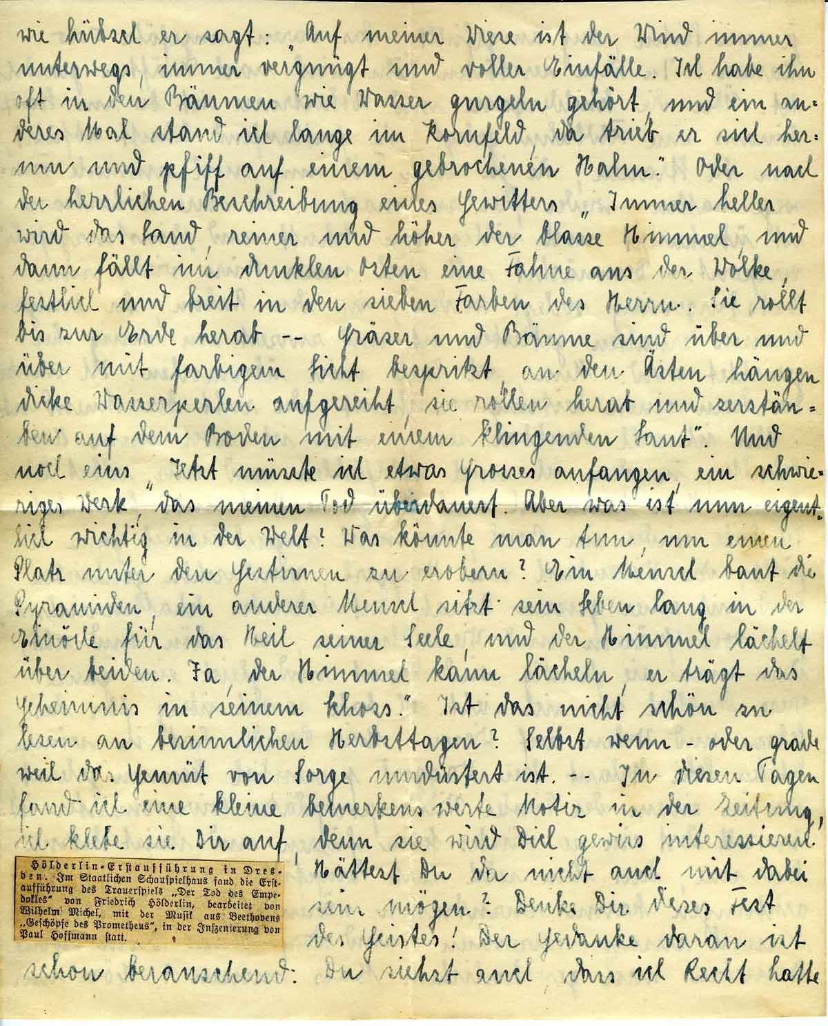 Ist das nicht schön zu lesen an besinnlichen Herbsttagen? Selbst wenn - oder gerade weil das Gemüt von Sorge umdüstert ist. - In diesen Tagen fand ich eine kleine bemerkenswerte Notiz in der Zeitung, ich klebe sie Dir auf, denn sie wird Dich gewiß interessieren. Hättest Du da nicht auch mit dabei sein mögen? Denke Dir dieses Fest des Geistes! Der Gedanke daran ist schon berauschend. Du siehst auch, dass ich Recht hatte
