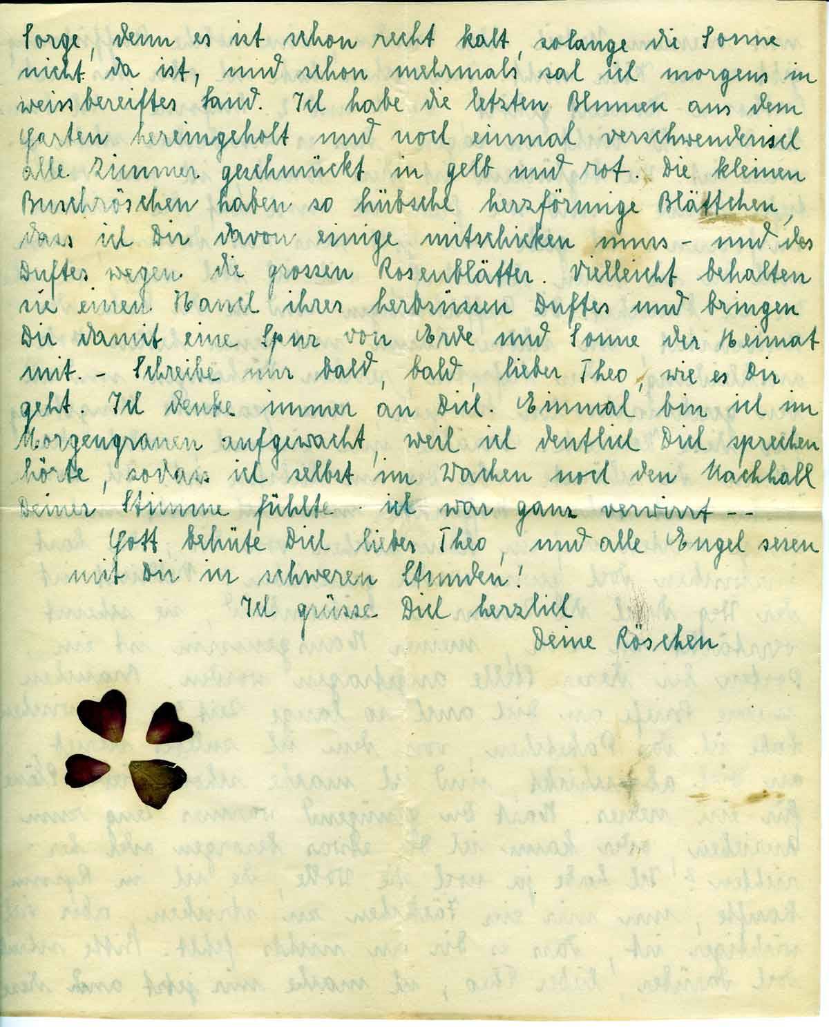 Sorge, denn es ist schon recht kalt, solange die Sonne nicht da ist, und schon mehrmals sah ich morgens in weißbereiftes Land. Ich habe die letzten Blumen aus dem Garten hereingeholt und noch einmal verschwenderisch alle Zimmer geschmückt in gelb und rot. Die kleinen Buschröschen haben so hübsche herzförmige Blättchen, dass ich Dir davon einige mitschicken muß - und des Duftes wegen die großen Rosenblätter. Vielleicht behalten sie einen Hauch ihres herbsüßen Duftes und bringen Dir damit eine Spur von Erde und Sonne der Heimat mit.-