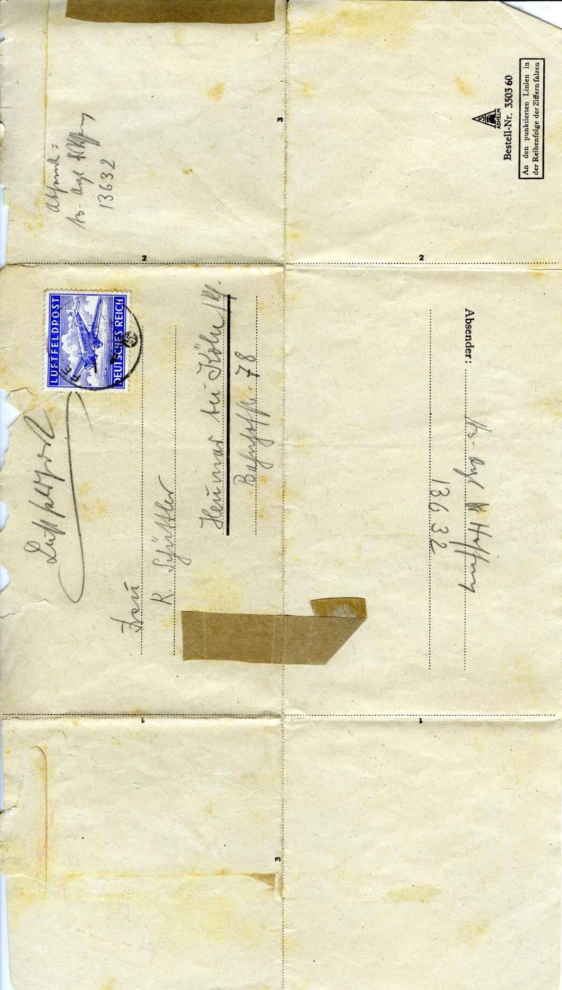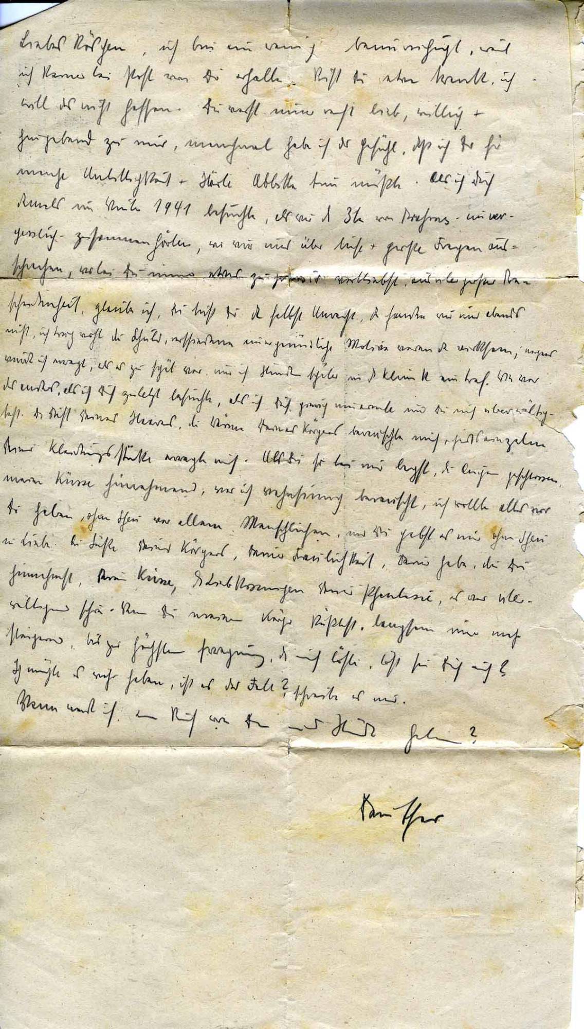 ich bin ein wenig beunruhigt, weil ich keinerlei Post von Dir erhalte. Bist Du etwa krank? - ich will es nicht hoffen. Du warst immer recht lieb und willig und hingebend zu mir, manchmal habe ich das Gefühl, dass ich Dir für manche Unbilligkeit und Härte Abbitte tun müsste. Als ich Dich damals im Winter 1941 besuchte, als wir die 3. Sinfonie von Brahms - unvergesslich – zusammen hörten, wir uns nur über tiefe und große Fragen aussprachen, wobei Du immer etwas zu passiv verbliebst, aus übergroßer Bescheidenheit, glaube ich, - Du tust dir selbst Unrecht, da fanden wir uns abends nicht. Ich trage wohl die Schuld, verschiedene mir ungünstige Motive waren da wirksam, [---] wurde ich erregt, als es zu spät war und ich Stunden später in der Klinik eintraf.