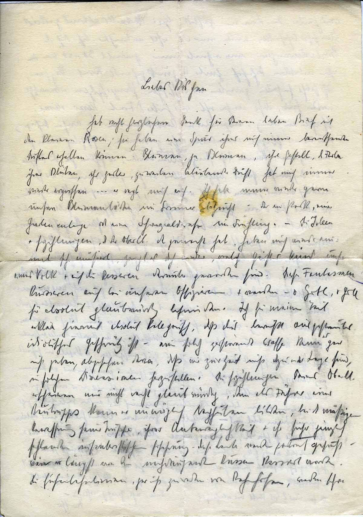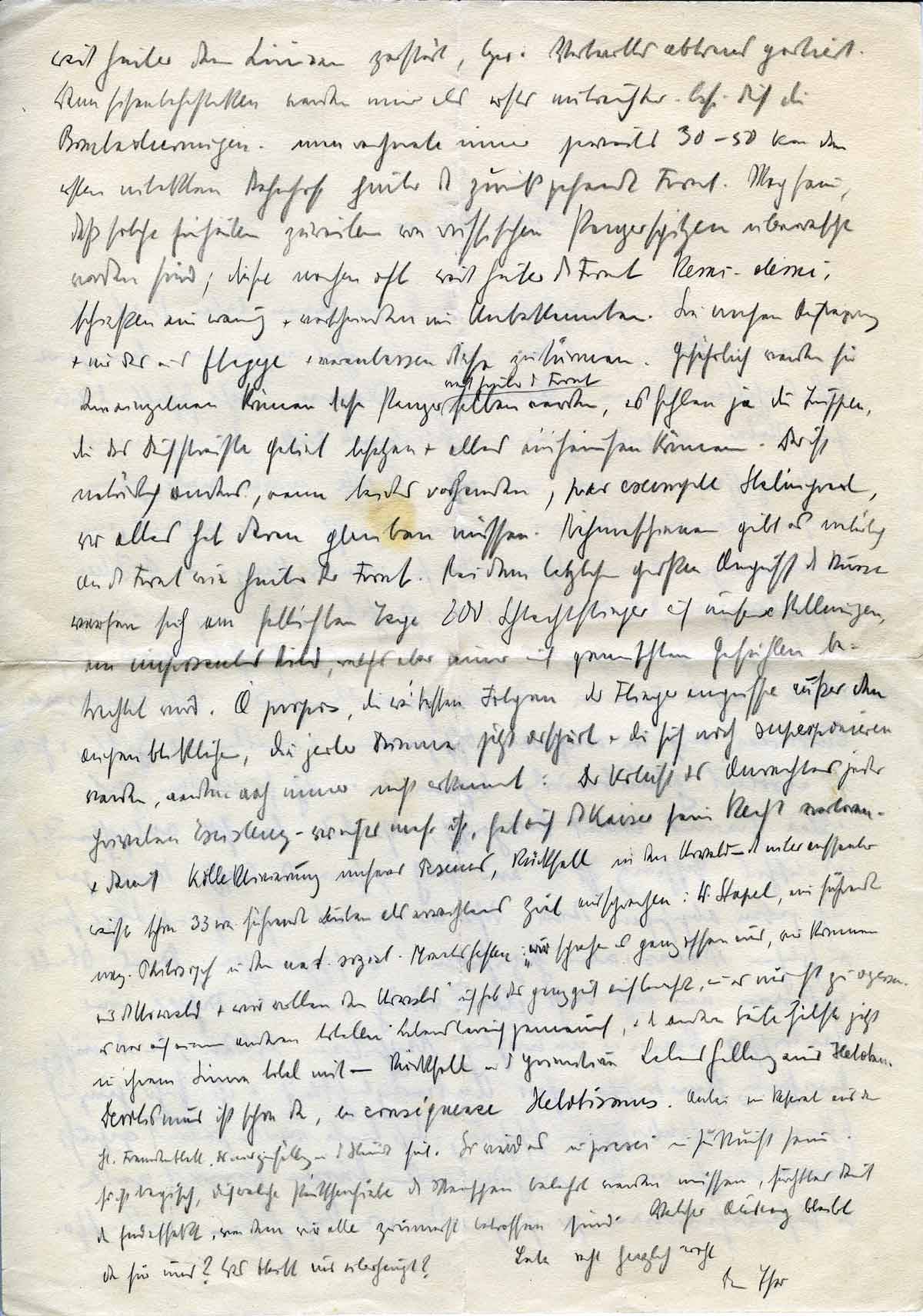 Die Ideen und Erzählungen, die der Oberleutnant gemacht hat, haben mich wieder einmal sehr amüsiert, zeigt es doch wieder, welch’ Geistes Kind unser armes Volk und auch die Besseren darunter geworden sind. Diese Fantasmen kursieren auch bei unseren Offizieren und werden - o Gott, o Gott - für absolut glaubwürdig befunden. Ich für meinen Teil erkläre hiermit absolut kategorisch, dass dies bewusst ausgestreutes idiotisches Geschwätz ist – eine solch zerstörende Waffe kann es gar nicht geben, abgesehen davon, dass wir zur Zeit nicht dazu in der Lage sind, in solchen Dimensionen herzustellen. Die Erzählungen Deines Oberleutnants erscheinen mir nicht recht glaubwürdig, denn als Führer eines Bautrupps kann er unmöglich Nachhuten bilden, bei der mäßigen Bewaffnung seiner Truppe, ihrer Unbeweglichkeit und ihr sicher gänzlich fehlenden [... stischen] Erfahrung - diese Leute werden partout gesucht – wäre er längst von den nachdrängenden Russen kassiert worden. Die Eisenbahnlinien, gar nicht zu reden von Bahnhöfen, werden schon