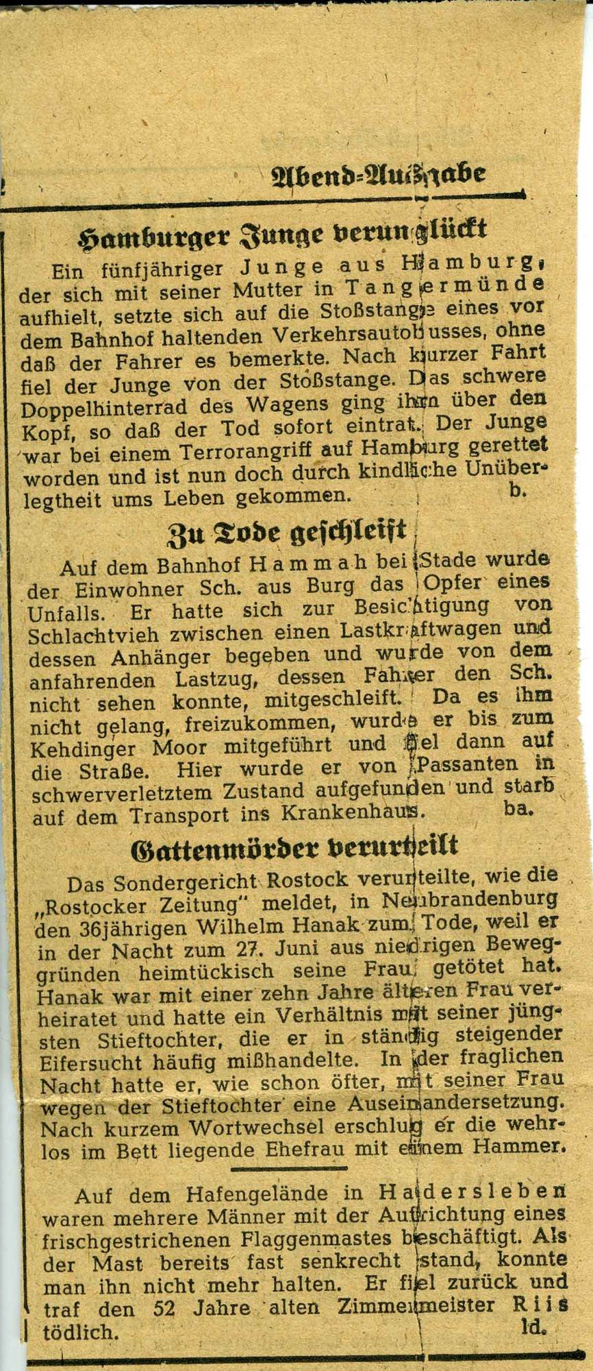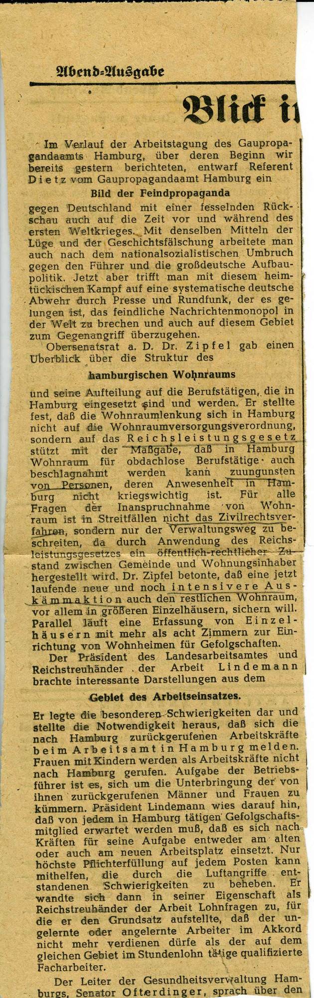 Anbei ein Referat aus dem Hamburger Fremdenblatt, das mir zufällig in die Hände fiel. So wird es [---] in Zukunft sein. Es ist tragisch, durch welche Peitschenhiebe die Menschen belehrt werden müssen, furchtbar damit der Endeffekt, von dem wir alle zumeist betroffen sind. Welcher Ausweg bleibt da für uns? Was bleibt uns überhaupt?