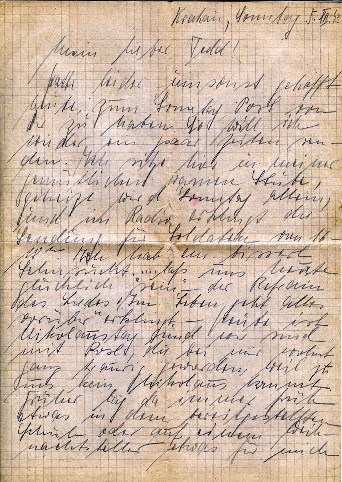 Hatte leider umsonst gehofft heute am Sonntag Post von Dir zu haben. So will ich wieder ein paar Zeilen senden. Ich sitze hier in meiner gemütlichen warmen Stube, geheizt wird Sonntag allein, und im Radio erklingt die Sendung für Soldaten von 16-18 Uhr. Ich hab ein bisschen Sehnsucht. „...laß uns heute glücklich sein“ – der Refrain des Liedes „Im Leben geht alles vorüber“ erklingt. – Heute ist Nikolaustag und wir sind mit Rosl, die bei mir wohnt, ganz traurig geworden, weil zu uns kein Nikolaus kommt. Früher lag da immer früh etwas in dem bereitgestellten Schuh oder auf einem Weihnachtteller, etwas für mich