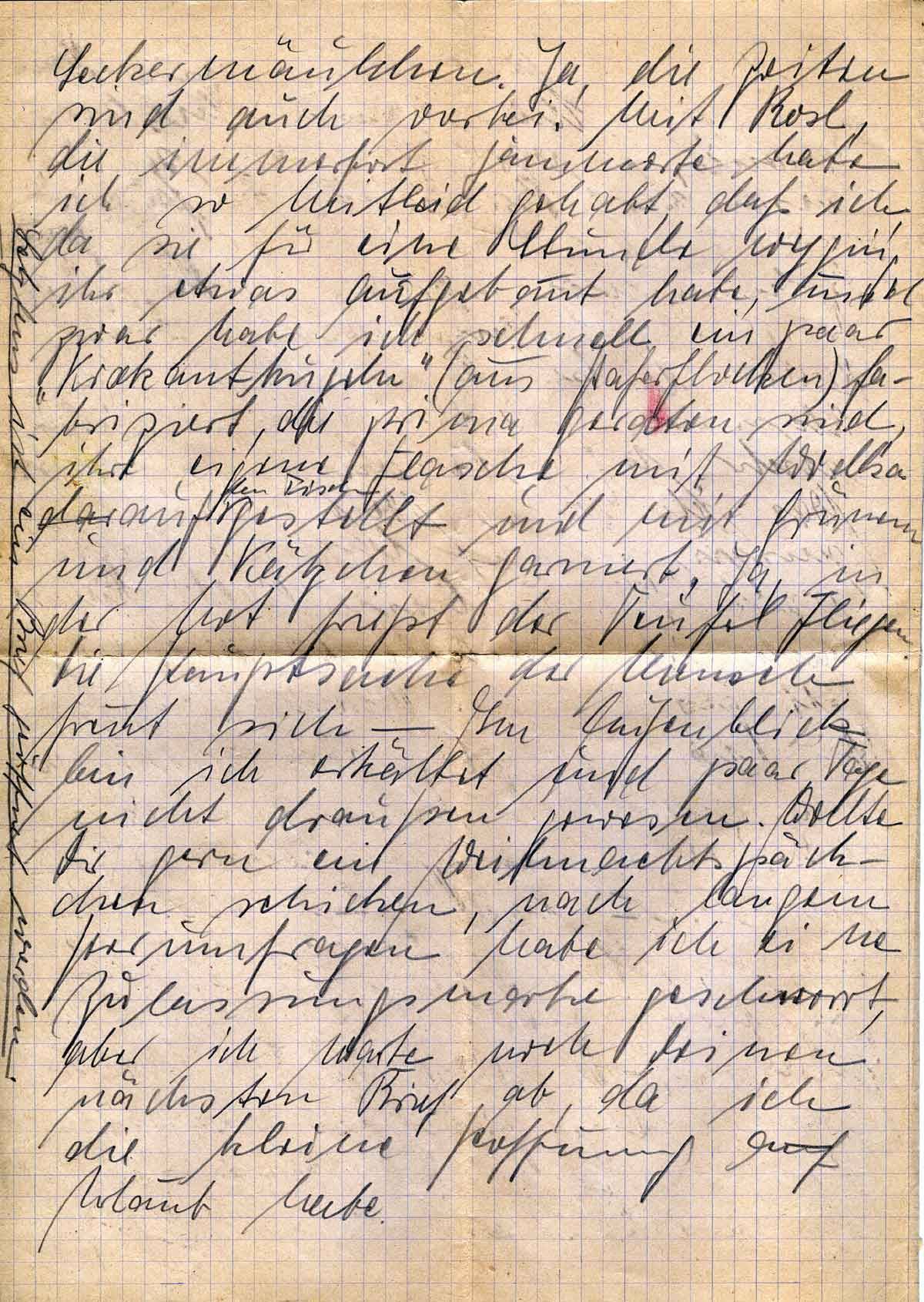 Im Augenblick bin ich erkältet und paar Tage nicht draussen gewesen. Wollt Dir gern ein Weihnachtpäckchen schicken, nach langem Herumfragen habe ich eine Zulassungsmarke geschnorrt, aber ich warte noch Deinen nächsten Brief ab, da ich die kleine Hoffnung auf Urlaub habe.